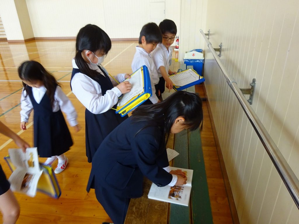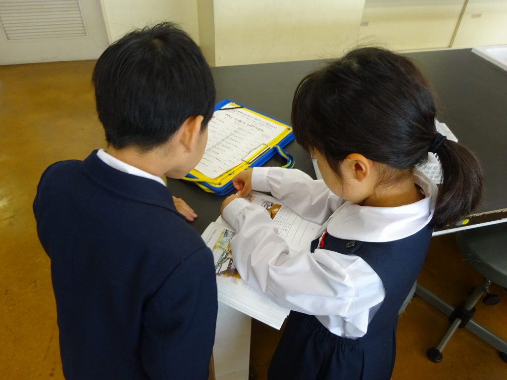 探検当日、朝から興奮ぎみです。「たんけん、たのしみ!!」「どんなへやが、あるのかな?」教室の中で集まっては探検の話ばかりです。自由活動室を出発して、1階から4階までを見てまわりました。教室の前には、クイズもありました。部屋を見学した後は、シールをガイドブックに貼りました。クイズもガイドブックも、2年生が準備してくれたものです。1年生が楽しめるようにと、時間をかけて作ってくれました。探検中、2年生が手をつないでリードしてくれました。優しく説明もしてくれました。1年生は大満足です。2年生ありがとうございました。これからも文理小学校のことを教えてくださいね。