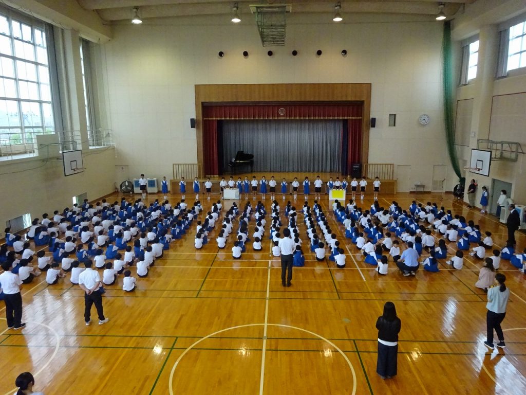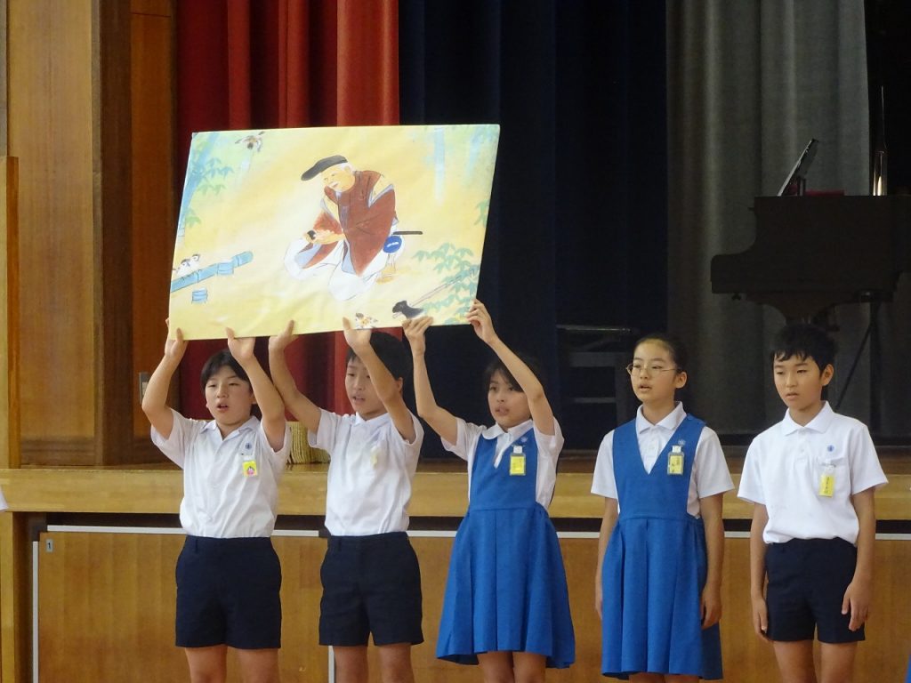 今日の朝会では、5年1組が竹取物語と平家物語を大きな声で堂々と朗読しました。一語一語をしっかり発音し、広い体育館に日本の素晴らしい文化が響き渡りました。
