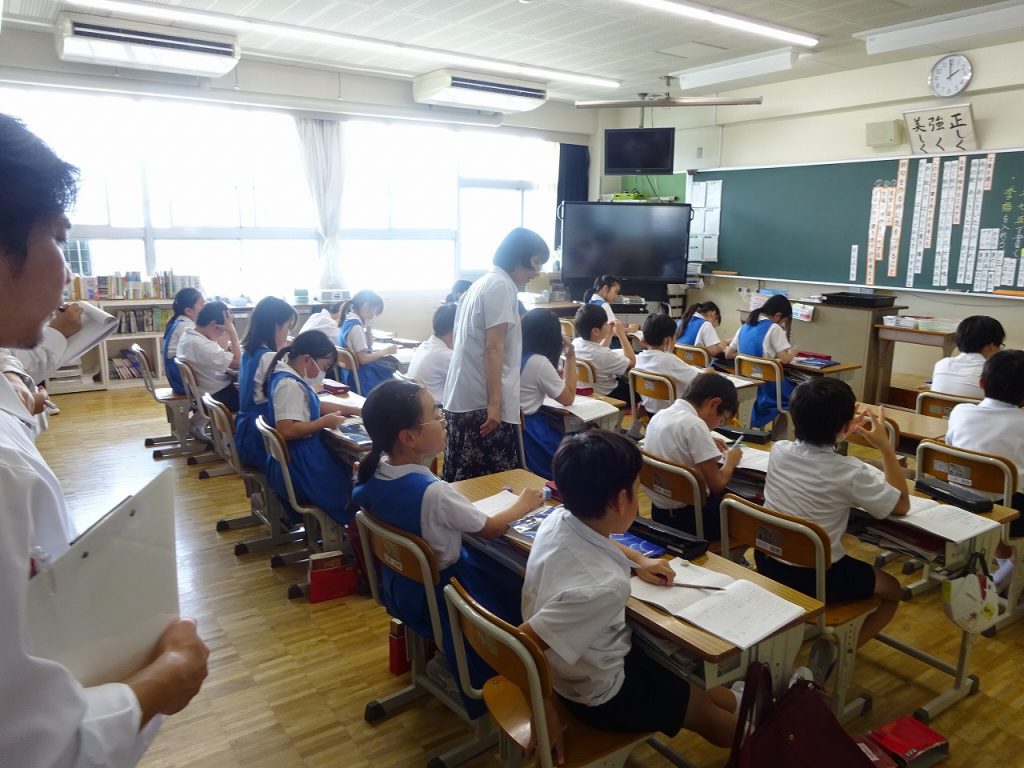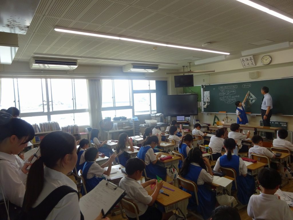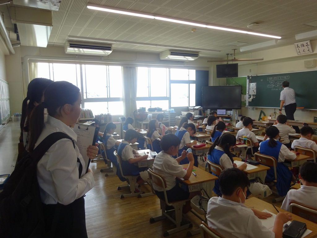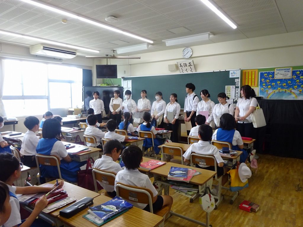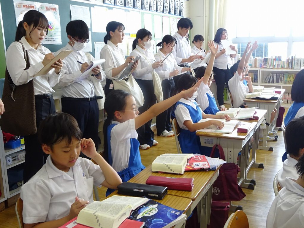 本日、徳島文理大学の人間生活学部児童学科の学生さんたちが授業参観に来ていました。毎年恒例の授業参観となっており、今年は5年生の国語と4年生の算数を参観しました。