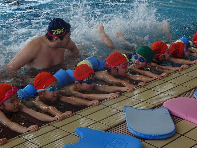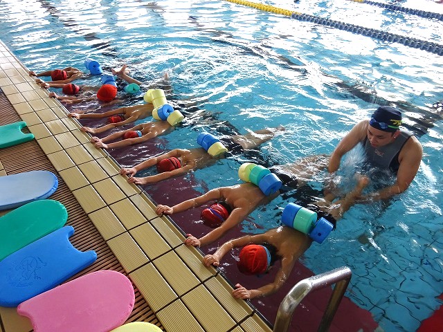 プールでは、5つの班に分かれ、めあてをもって実習します。まだ、泳げない子どもたちも、水泳のプロの方が優しく教えてくださり、少しずつ緊張がほぐれ、笑顔が出てきていました。泳ぐことができる子たちは、さらに泳力を伸ばすために一生懸命に練習していました。
