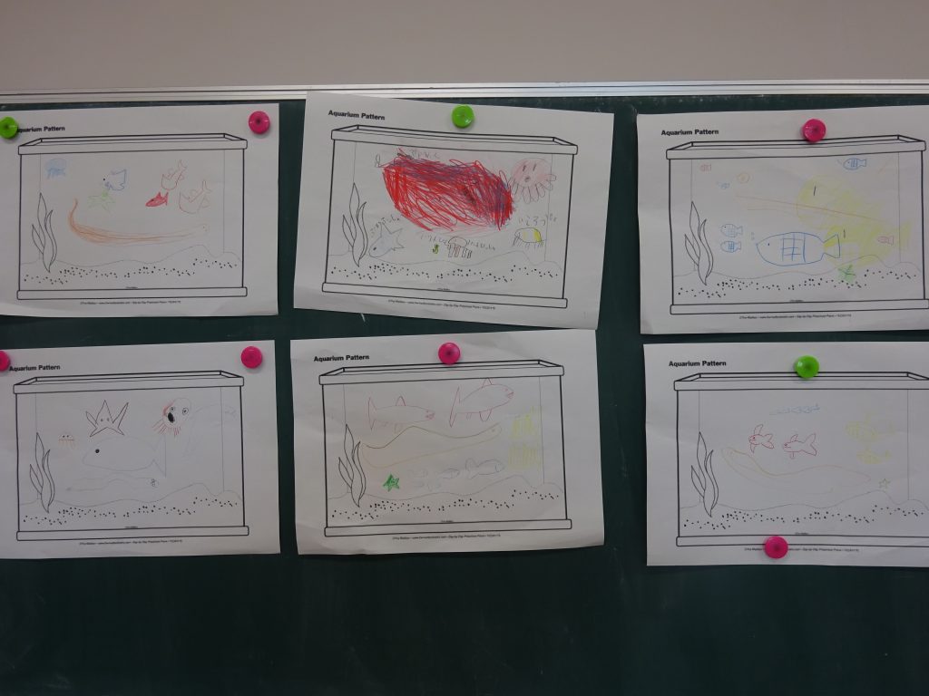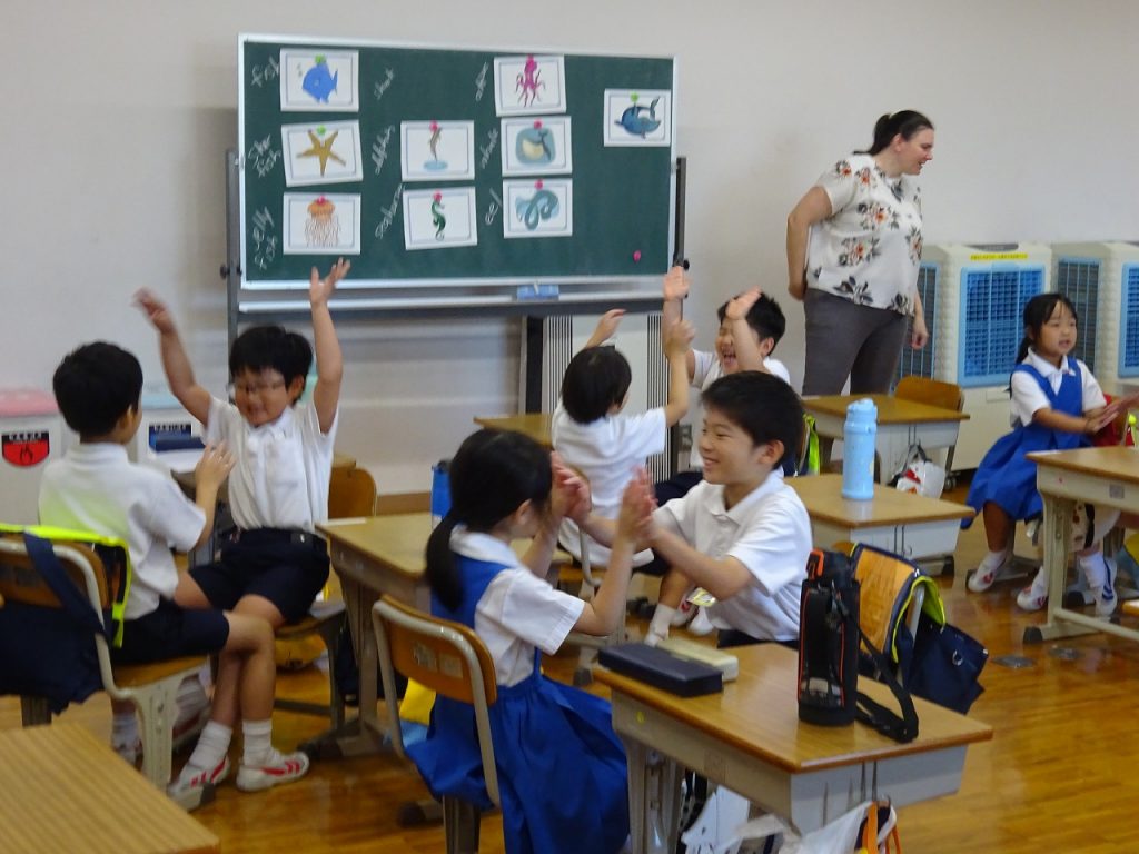 まず生き物の生き物の名前を教えてもらいました。ペアで魚の名前が呼ばれたときにハイタッチしたり、10人グループで伝言ゲームをしたりしました。