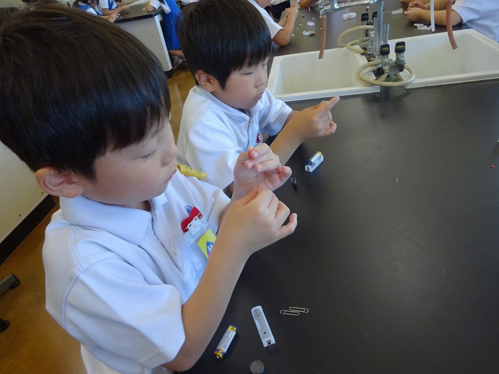 「ミニモーター」は、電池、コイル、紙ヤスリ、クリップ、磁石、テープを用いて作りました。実際にうまくいくと、コイルがくるくると回転する作りになっています。しかし、なかなか回らなかったり、揺れるだけだったりと上手に実験できていませんでした。失敗しながら、作り直しを行って、最後の方には、綺麗に回って「回った!」や「やったー!」など喜んでいる声が上がっていました。
