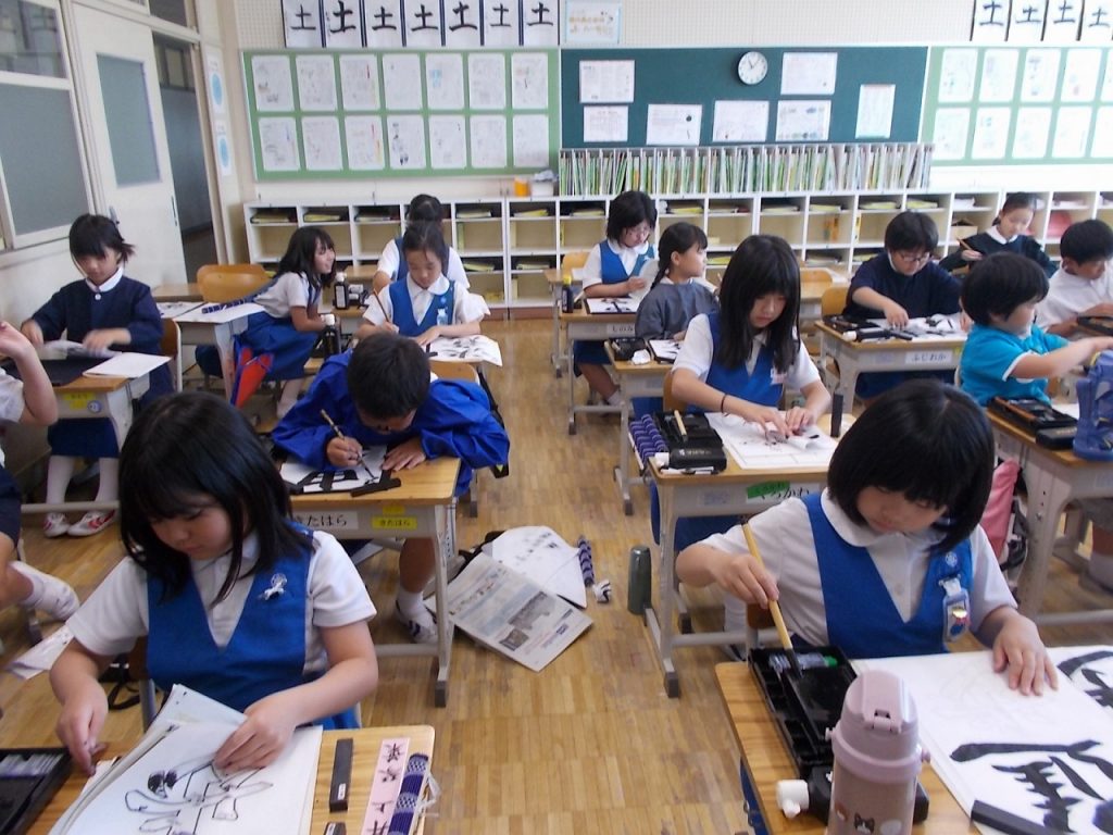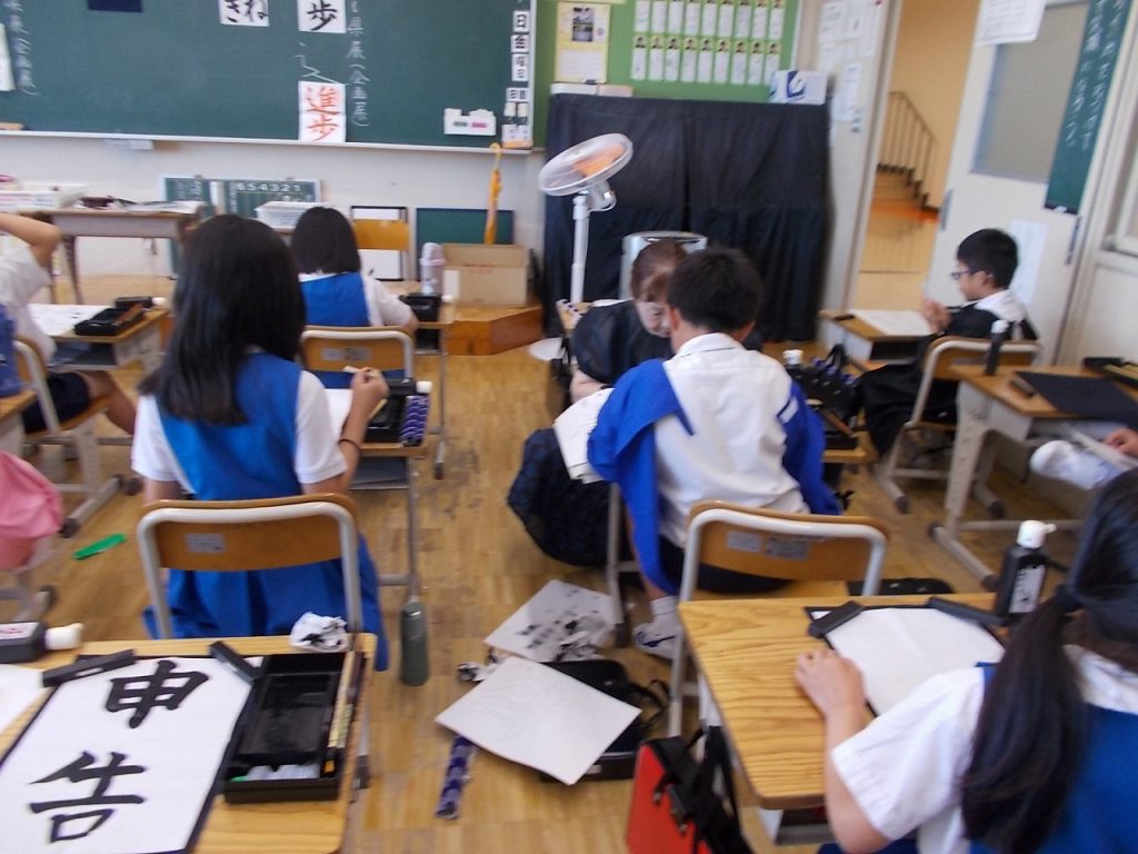 本日、預かり教室で夏休み特別教室として、中学年の習字教室を行いました。指導したのは、書写の専科をしている春藤先生です。いつも指導してもらっているので、慣れた様子でした。夏休みの宿題に出されている応募作品を一生懸命に仕上げていました。