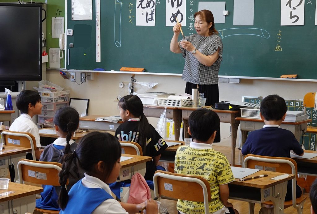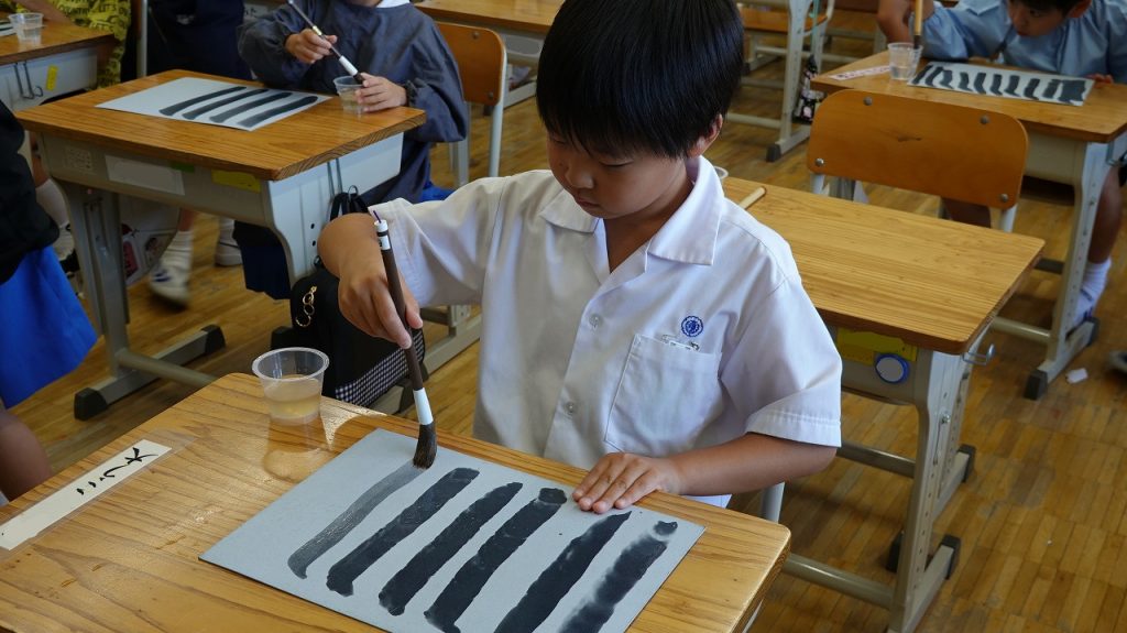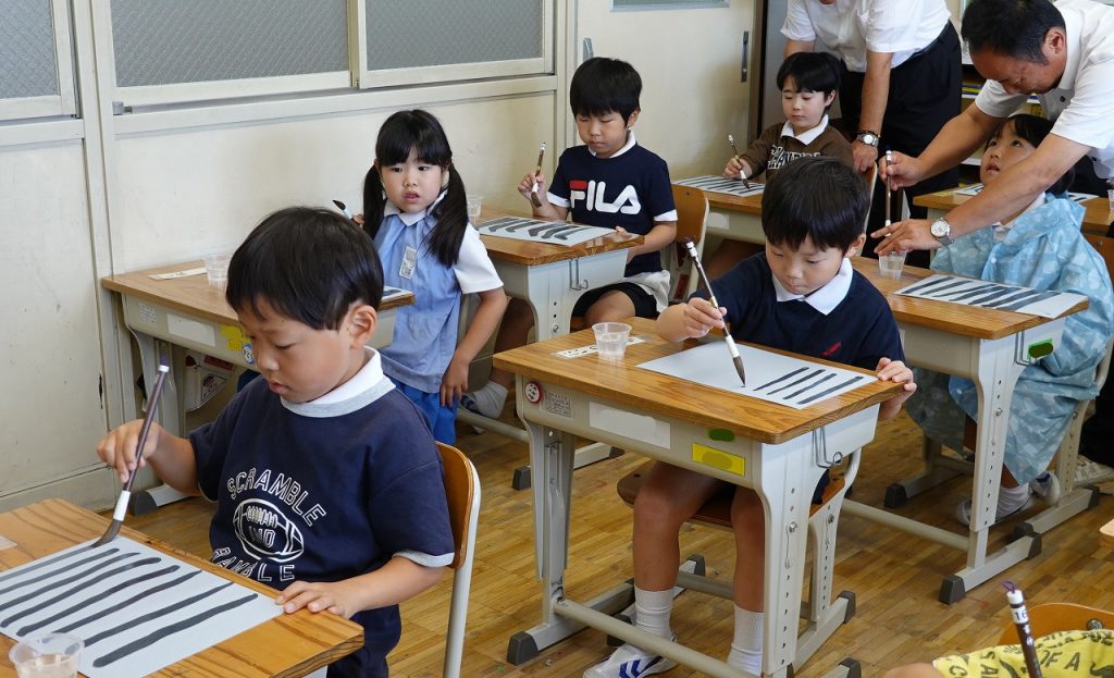 何分ともに、学校での毛筆指導は3年生からとなっているため、全く初めて筆を持つ子どもたちもいて、筆の持ち方から、立てや横の線を書いたり、うったてをどのようにするか学んだりしました。
