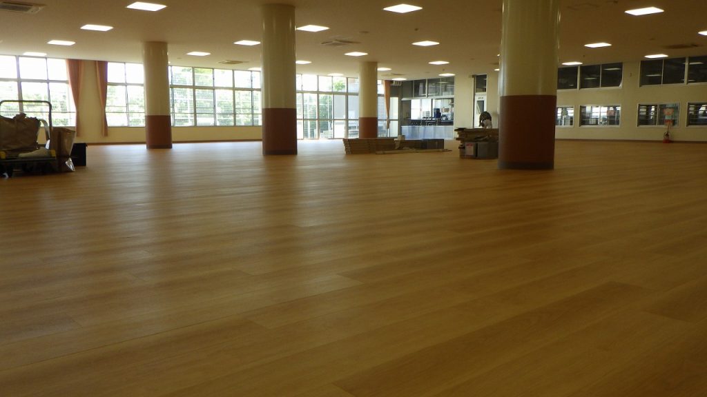 本日は、ランチルームの床が、きれいに張り替えられました。新しく明るい色調で、全面が貼り終わり、柱の下の部分もきれいにシートを貼られました。