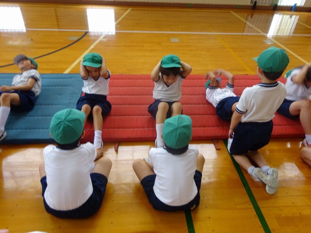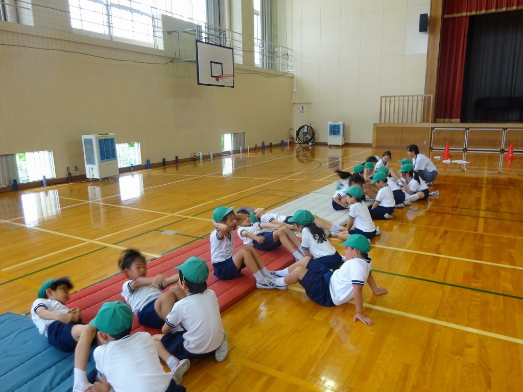 2年生の文理ンピック3種目めは「早寝早起き」です。起き上がるときに「おはよう」、仰向けになるときに「おやすみ」と言いながら、腹筋運動を1分間行います。