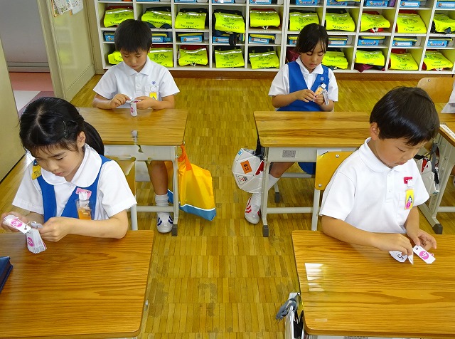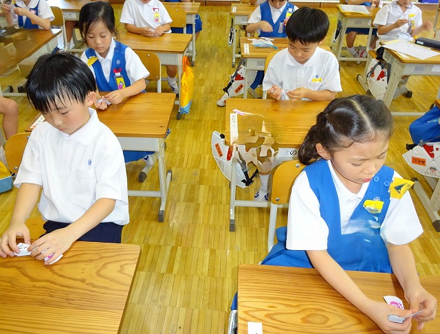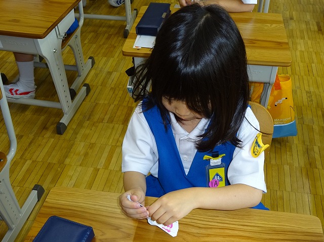 たしざんの学習が終わって、計算カードの練習が始まりました。今日で、1週間になります。毎日の宿題だけでなく、朝の時間や算数の時間にも練習しています。45枚のカードを1分以内に答えるのが目標です。朝から「検定受けます!」と練習の成果を試す子どもたちが並びます。合格者も次々と現れています。それに刺激を受けて、「わたしもがんばる。」「もっとはやいタイムにしたい。」と他の子どもたちも熱が入り始めました。みんなで力を伸ばしていこうね。