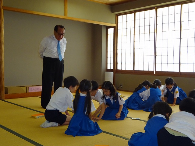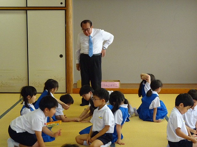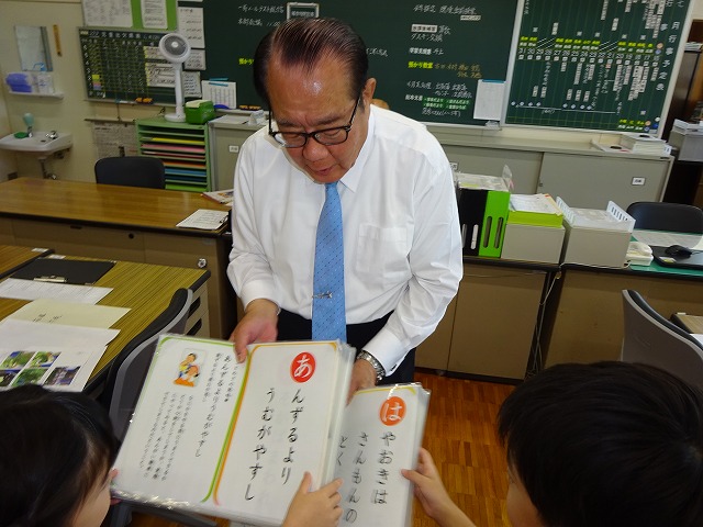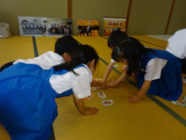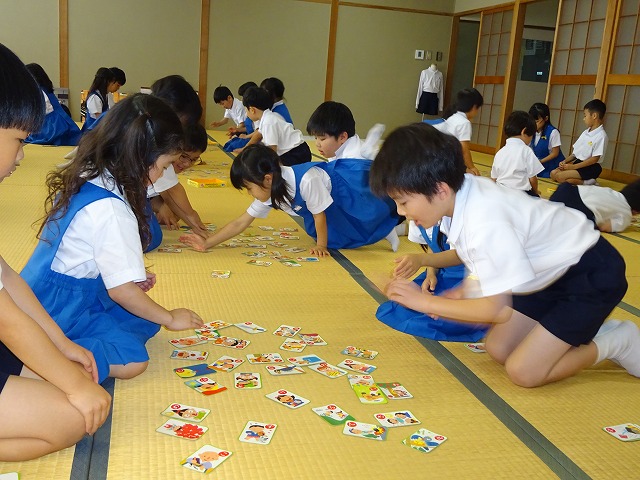 今日、2回目のカルタ大会をしました。ルールを守って参加することを大切にして楽しみます。ことわざも、しっかり覚えたので、反応がよくなりました。1枚の札に、みんなの手が一斉に伸びるほど白熱しました。「今日で、ことわざの学習が終わりです。」と、校長先生がお話してくださると、「もっとしたかったな。」「ざんねん。」の声がたくさん。楽しみにしていてください。2学期も、校長先生との楽しい学習の時間が待っていますよ。
