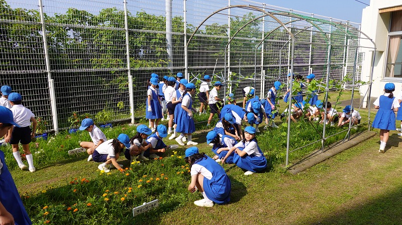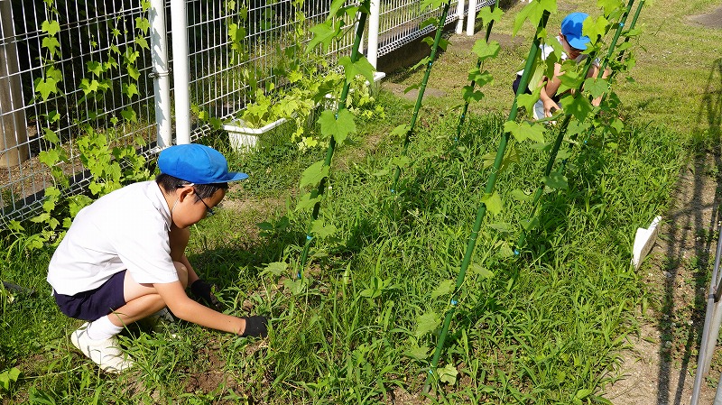 朝一番の、気温がまだ上がっていないうちの短時間勝負です。子どもたちが一生懸命取り組んでくれたおかげで、あっという間にきれいになりました。ヘチマの生長が楽しみです。
