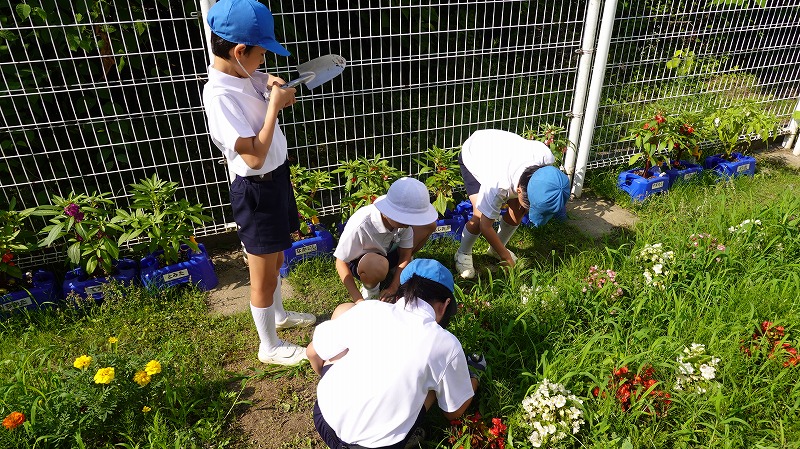 4年生はヘチマを育てています。ヘチマを育てている学級園が雑草だらけだったので、全員で草抜きを行いました。