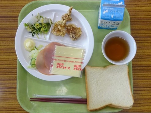 本日のメニューは、サンドイッチ、のり塩チキン、白菜と水菜の赤しそ和えでした。