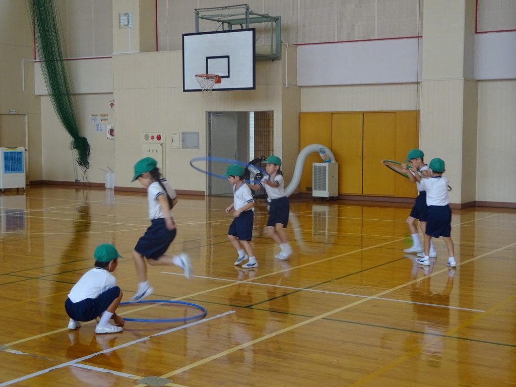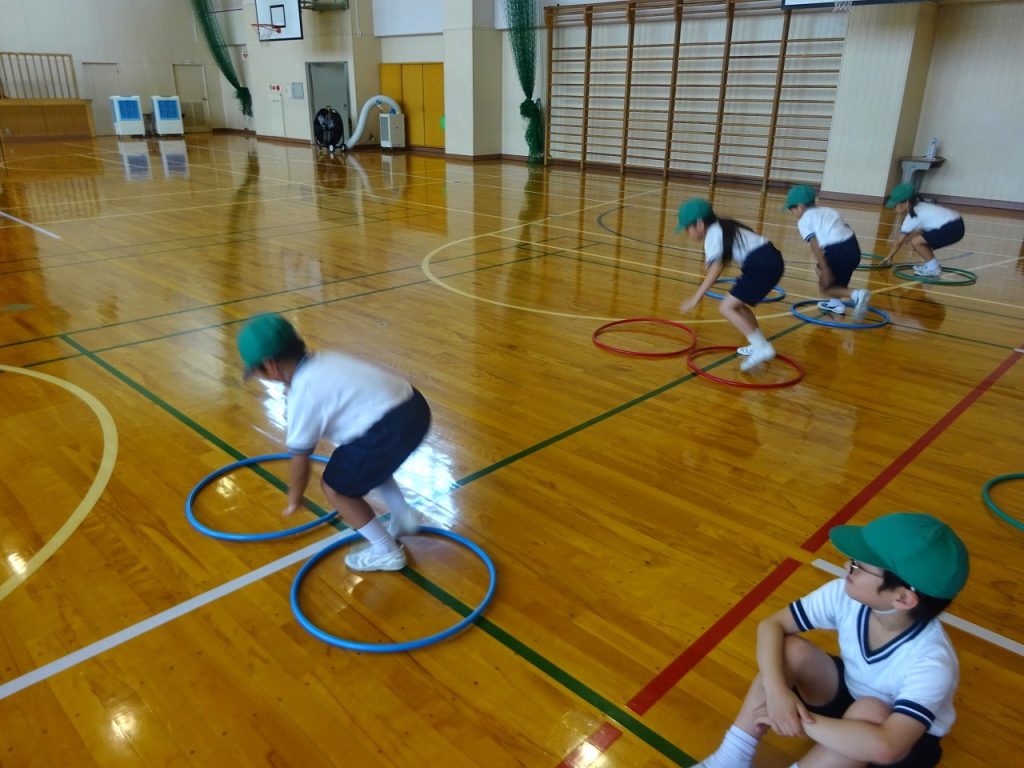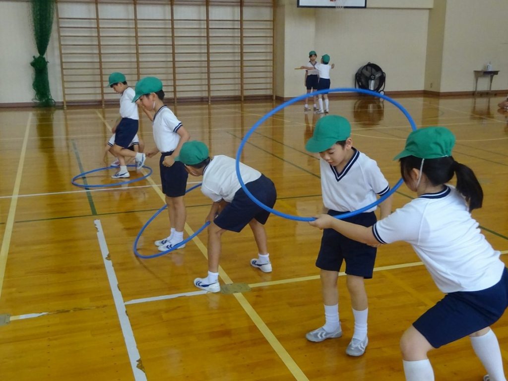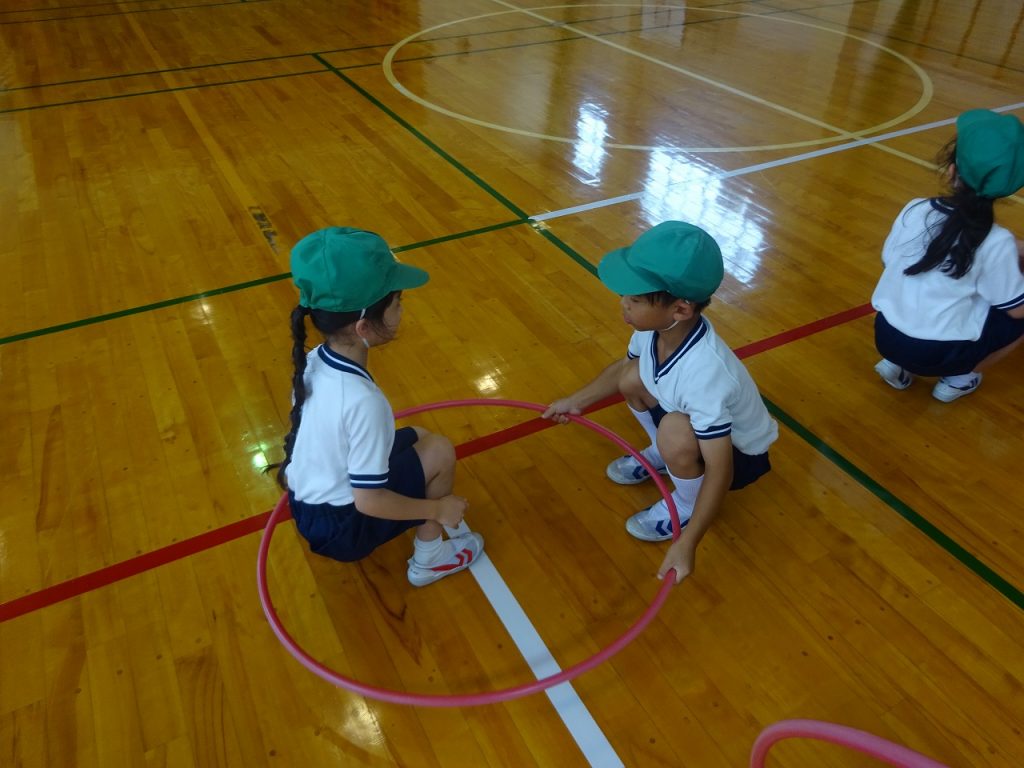 次は、ペアになって行うフラフープを使った遊びです。一人がフラフープの中に入り、もう一人が下から上にフラフープを抜いて前に置き、それを繰り返しながらフラフープの間を移動していくゲームです。ペアの人と相談して、どうすれば早くゴールにたどり着くことができるのか、真剣に相談します。「リズムよくいこう」「しゃがんだままの方が早いかな」「上に持ち上げずにひっくり返すのはどうかな」など、様々な工夫を考えていました。