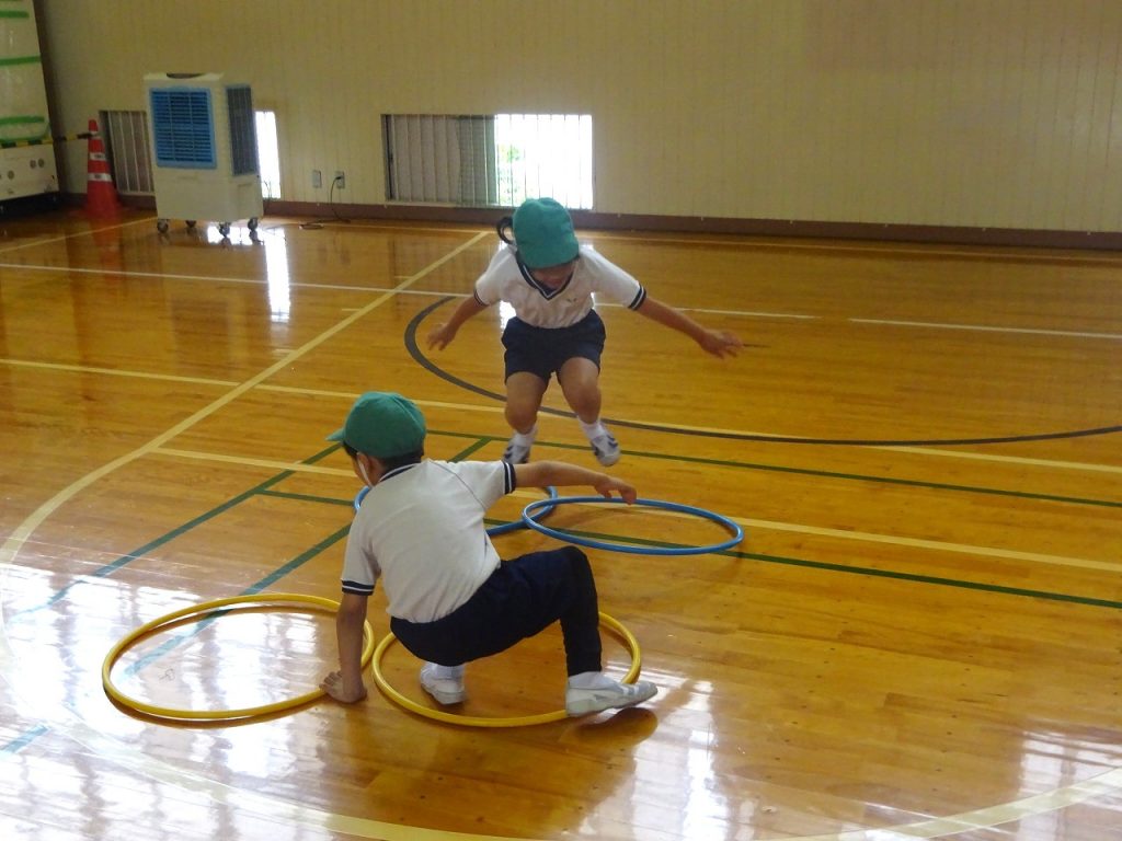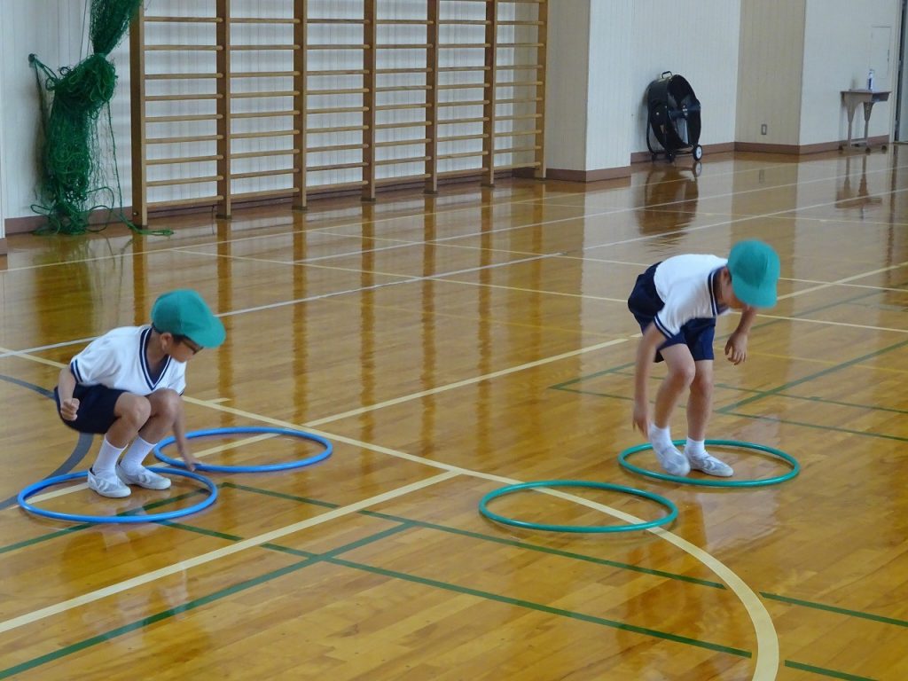 まずは、 フラフープを2つ使った「フラフープわたり」です。自分の後ろにあるフラフープを前に置いて、フラフープの間を移動しながら進むゲームです。しゃがんだり、中腰の姿勢になる動作が多く、「楽しいけど足がいたい!」と言っている子がたくさんいました。回数を重ねると少しずつコツをつかんできたようで、できるだけコンパクトな動きでフラフープを前へ前へと運んでいました。