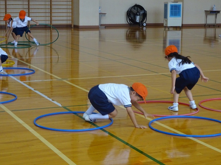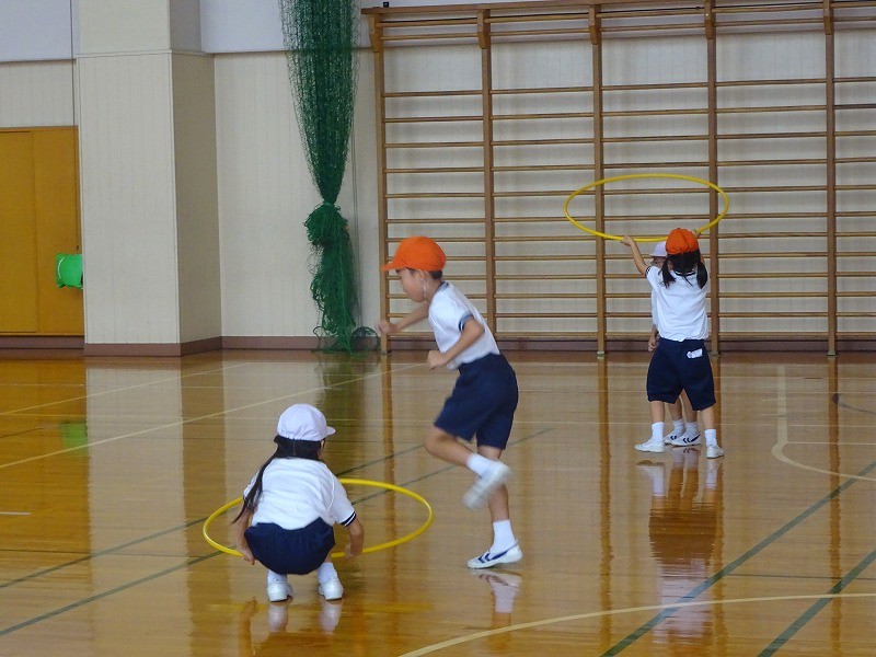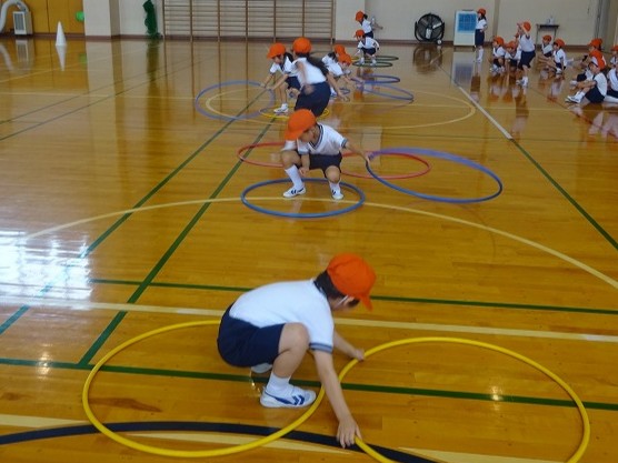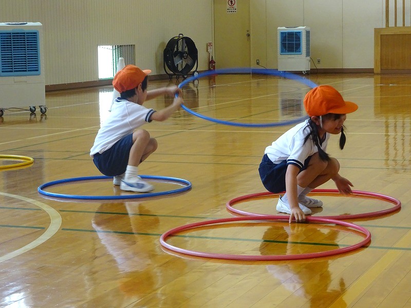 2年生に続いて、1年生もフラフープを使った遊びをしました。