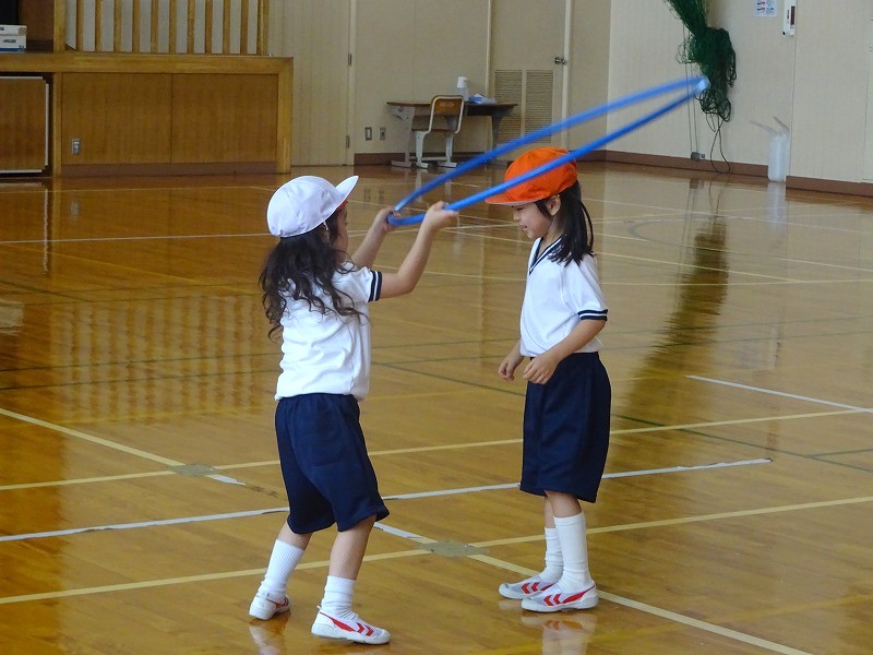 次は、ペアになって行うフラフープを使った遊びです。一人がフラフープの中に入り、もう一人が下から上にフラフープを抜いて前に置き、それを繰り返しながらフラフープの間を移動していくゲームです。友だちにフラフープを当てないように慎重に、でも早くゴールにたどり着くように、息を合わせて頑張ります。