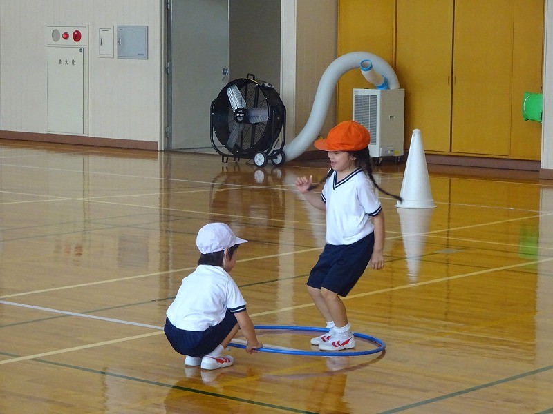 まずは、 フラフープを2つ使った「フラフープわたり」です。自分の後ろにあるフラフープを前に置いて、フラフープの間を移動しながら進むゲームです。早くゴールにたどり着くために、みんな一生懸命です。