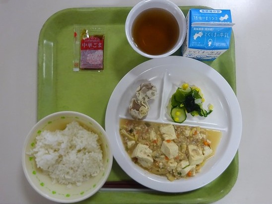 本日は給食試食会の最終日で、高学年の保護者の方にお越しいただきました。本日のメニューは、ごはん、麻婆豆腐、海藻サラダ、シューマイでした。試食会の後は前回と同様、給食を食べていただいた感想や意見を言っていただきました。