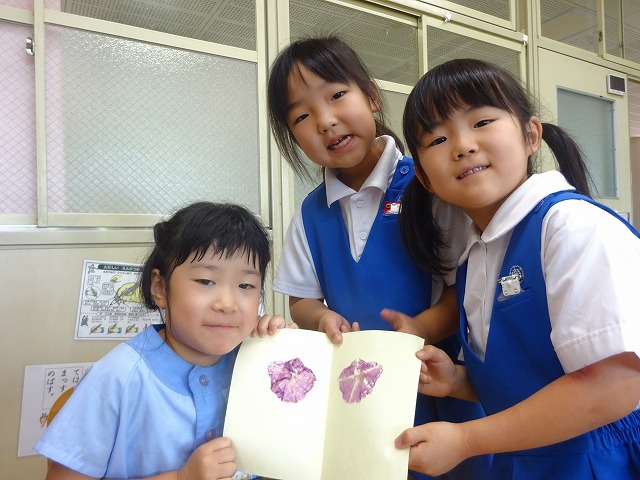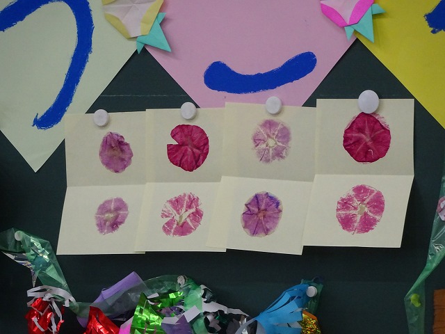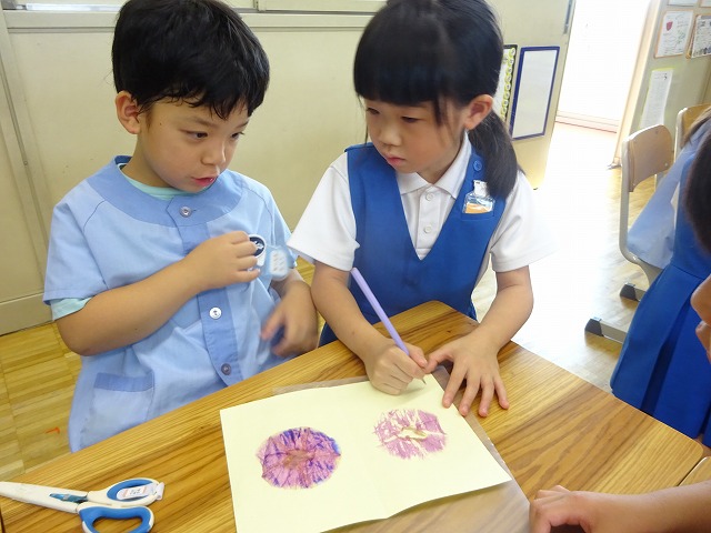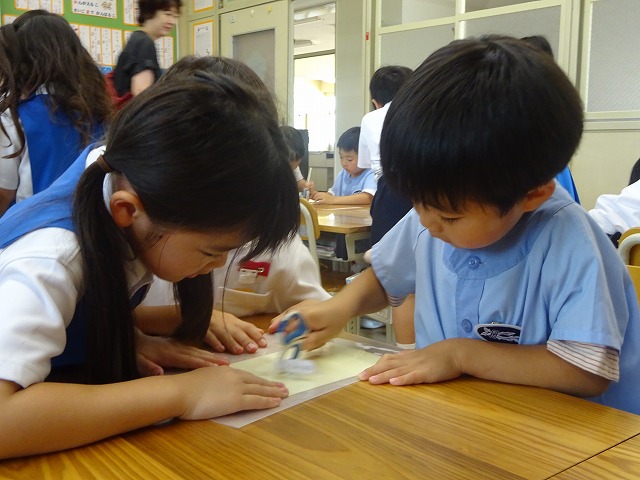 七夕集会の後、文理幼稚園の年長さんと1年生が交流を行いました。 教室では、まず自己紹介をして名前を覚えました。知っている友だちもいて嬉しそうでした。そして、学校探検で見つけたことを紹介したり、アサガオのこすり染めをしたりして遊びました。最後に、七夕の歌をみんなで歌って踊りました。
