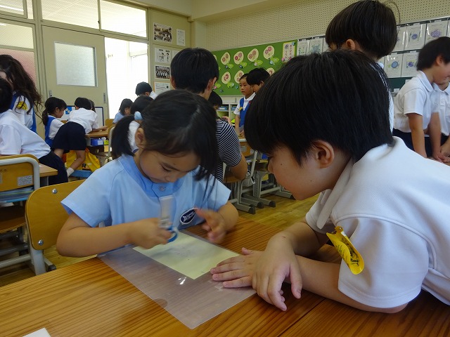 最初、緊張気味だった幼稚園の子どもたちも、1年生の声かけやサポートに笑顔になっていきました。手をつないで席まで連れて行ってあげたり、こすり染めをするときに「がんばれ!」「じょうずだよ!」と応援したりするのを見て、頼もしく感じました。年長さんが楽しんでくれている様子を見て、1年生もとても嬉しそうでした。