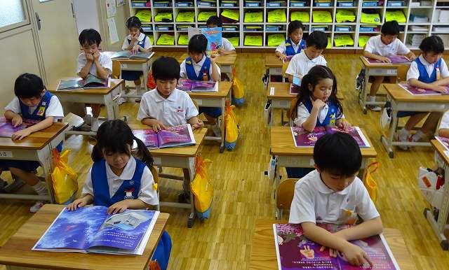 本を寄贈していただけると知って、1年生の子どもは大喜びです。教室で一人ずつ手渡していただくと、「わあ、きれいな本だな。」「はやく読みたい!」「さくらいろの馬だ。」の声がたくさん。その後、さっそく本を開いて読んでみました。家に帰って、お家の人と一緒に読むのも楽しみなようです。どの子も大事そうにランドセルに入れていました。原田さん、三木さん、ありがとうございました。