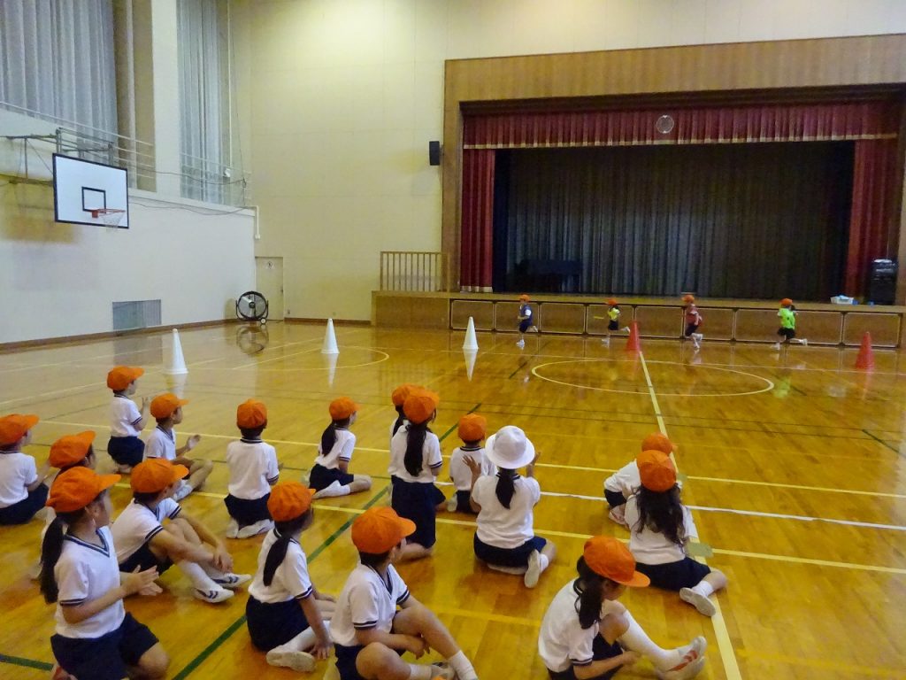 今日は1学期最後の体育の授業でした。1年生は、9月の運動会に向けてリレーの練習を行っています。小学校に入学してからはじめての運動会。みんな一生懸命、練習を頑張っています。また、体育館にもエアコンがついたため、快適に練習を行うことができています。