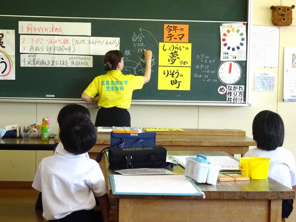 今日は、徳島文理大学の結城先生をお招きし、こども美術展「企画部門」の課題『未来へ』に取り組みました。中学年は「将来の夢」または「理想の町」が課題です。先生からは、主役は大きく描くというお話があり、好きな色のクレパスで下描きをし、絵の具で色を塗りました。