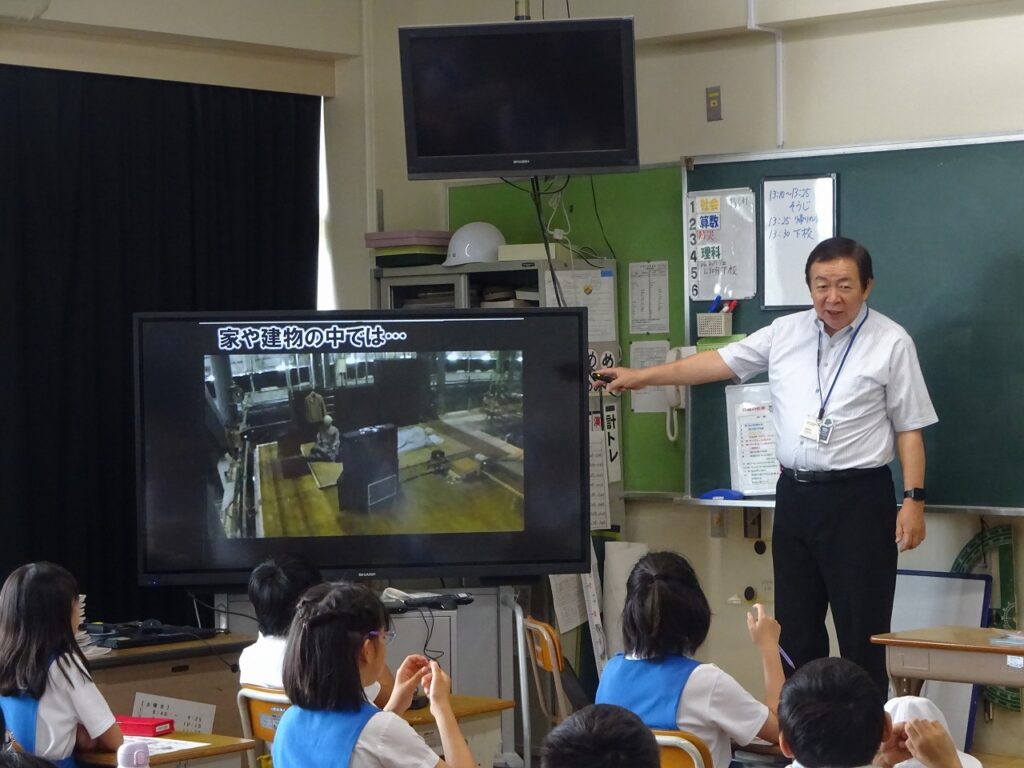 「徳島でおこる南海トラフ地震 ~文理小学校の周りは大丈夫?~」というテーマでお話をしてくださいました。地震が起こる仕組みやこれまでの地震被害の映像、ハザードマップ等を活用してのお話に子どもたちは興味深く聞き入っていました。また、30年以内に80%の確率で南海トラフ地震が起きるかもしれないこともわかりました。