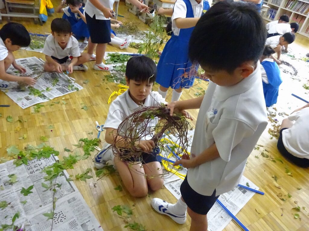 昨日は、みんなであさがおのリースづくりにチャレンジしました。支柱によく巻きついた、ツルを外しました。元気に育っていたあさがおに少し苦戦しながらも友達と協力して頑張りました。次に、葉っぱを取り、丸く形を取ってリースの形にしていきました。外すときよりもスムーズに形を作ることができました。