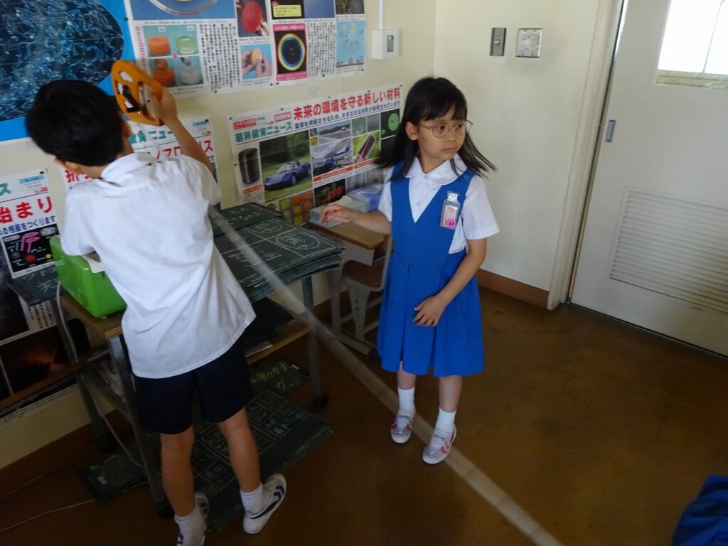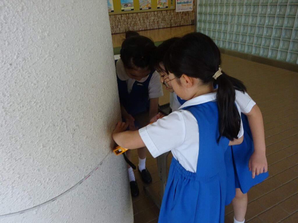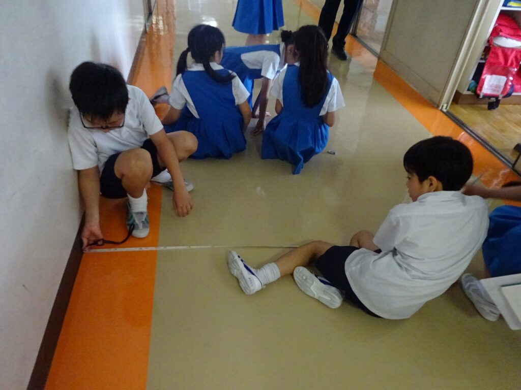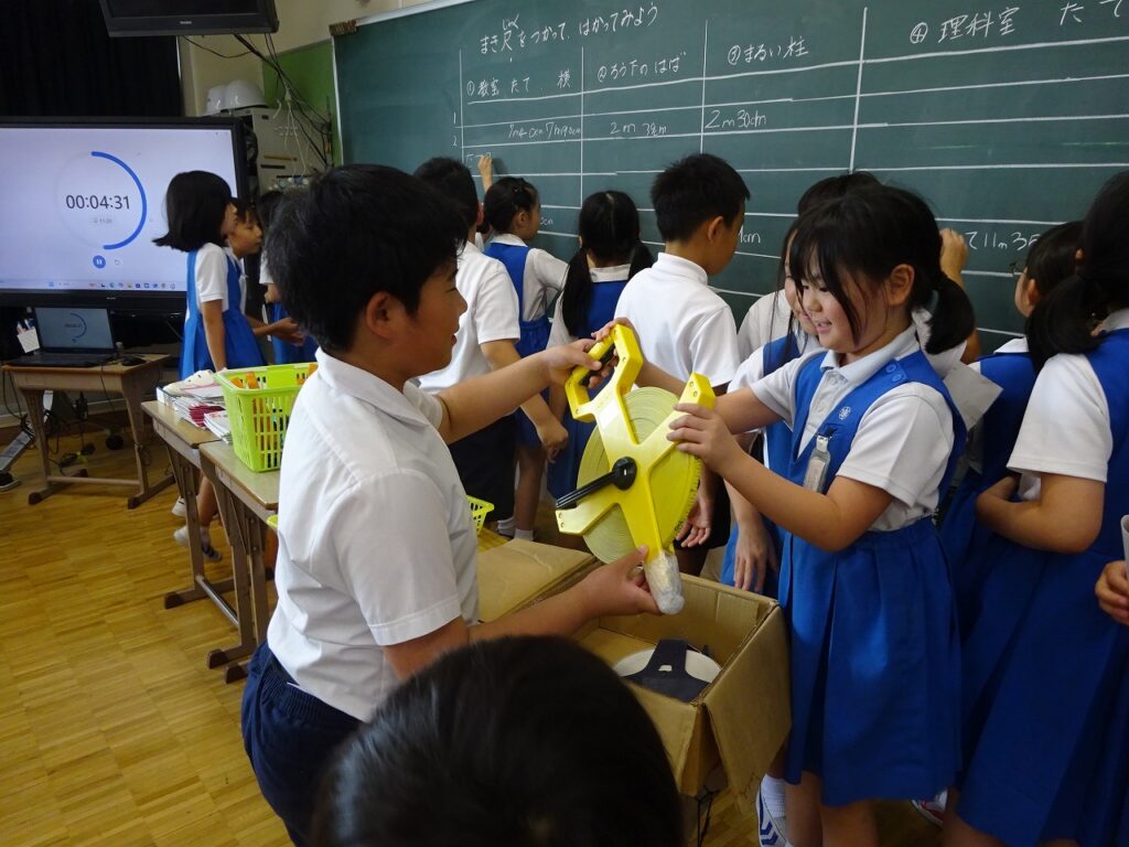 本日、算数で巻き尺を使って様々なところの長さを測りました。教室や、廊下の幅、柱など様々なものの長さを測りました。教室の長さを測る前は横の方が長いという意見が多かったのですが、測ってみると、ほぼ縦と横の長さが同じで子どもたちは驚いた様子を浮かべていました。なかなかピンと張って測ることが難しかったようでしたが、頑張って行えていました。