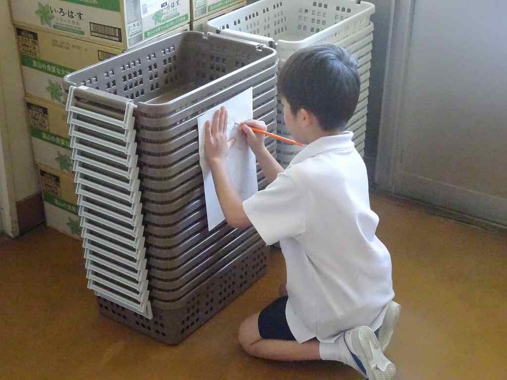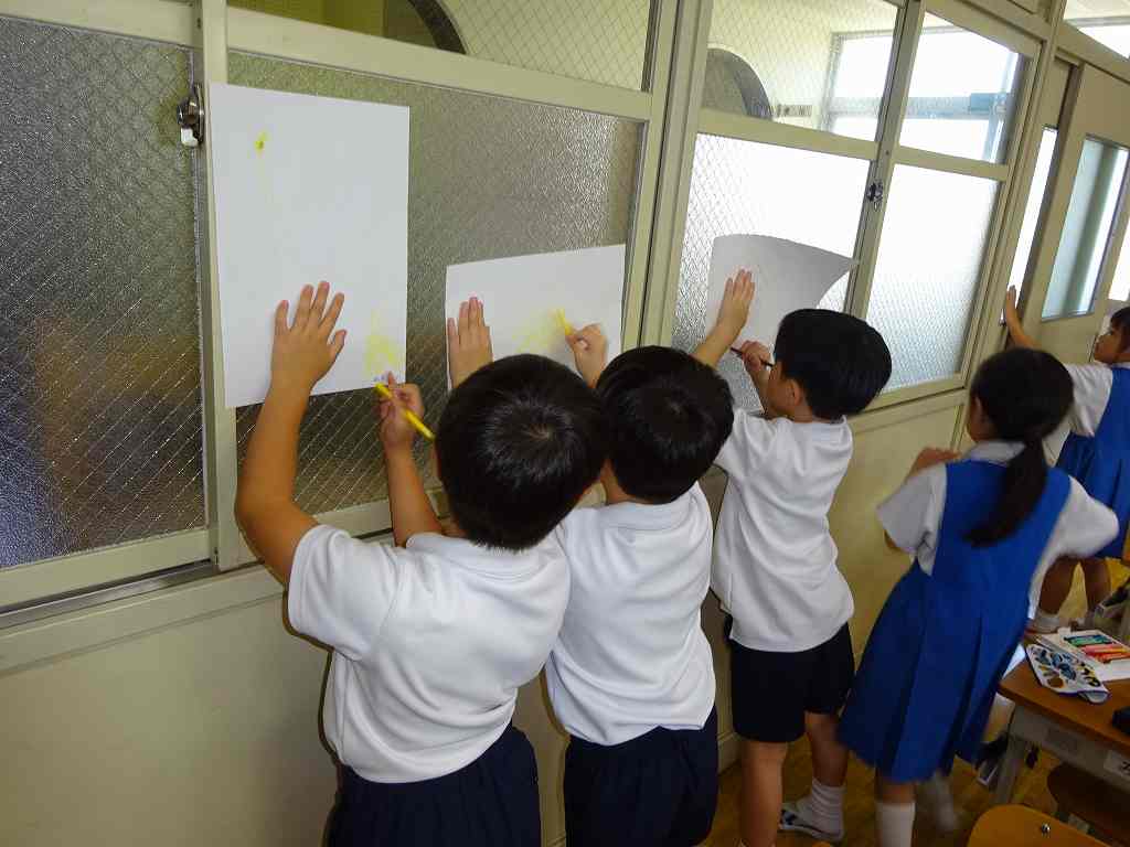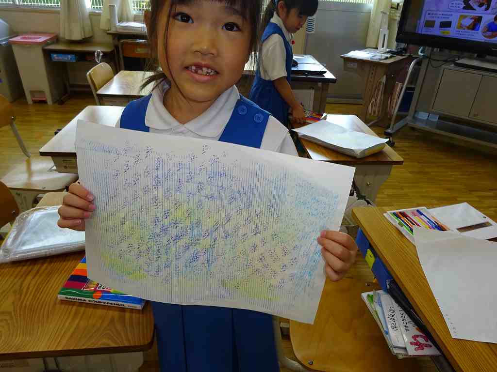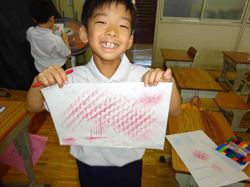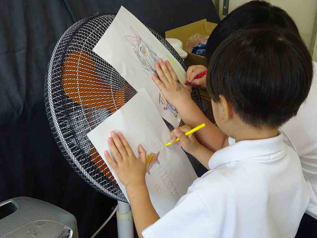 今日の図工は、身の回りにある凸凹を探して、紙を当ててクーピーでこすりだしをする活動です。窓やかご、ジッパーの袋等を使ってこすりだしをしました。一人がやってみると、「わぁ~」と驚きの声が聞こえ、「やりたい!」「まねしたい!」と口々に言い始めて、一斉にこすり始めました。