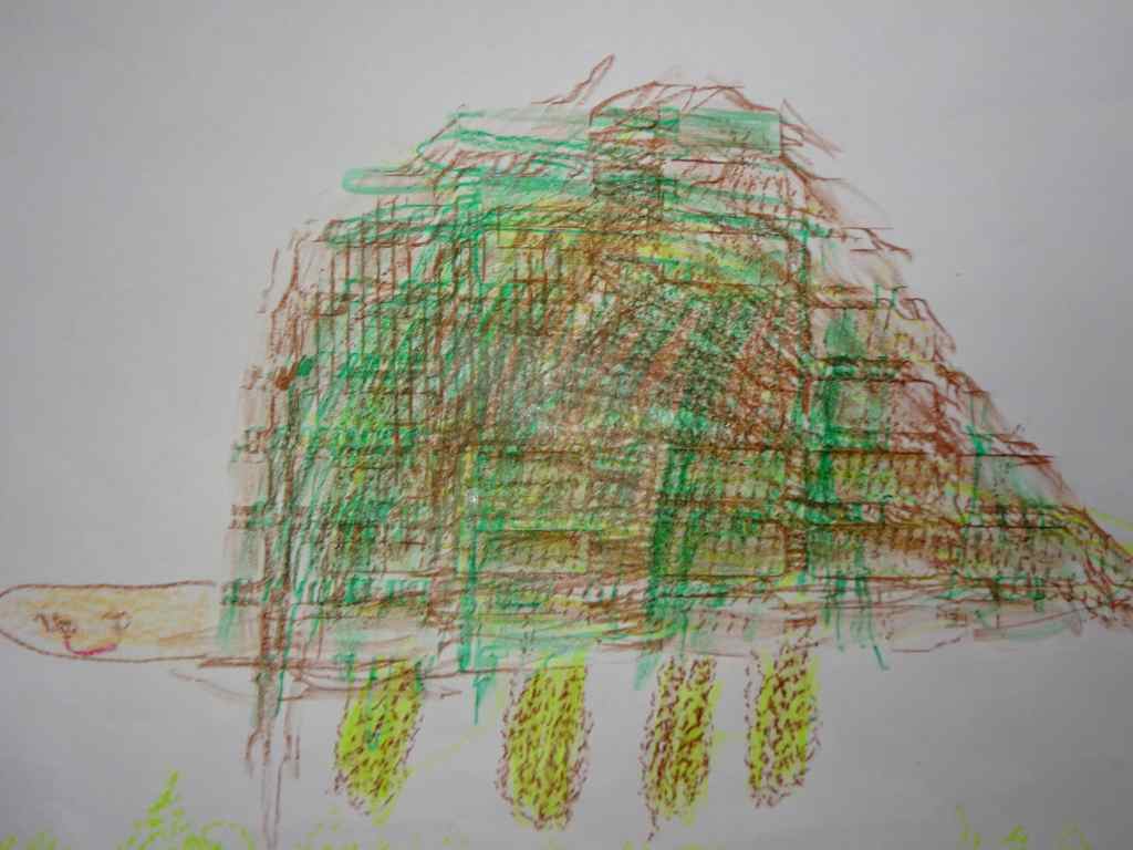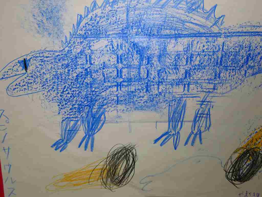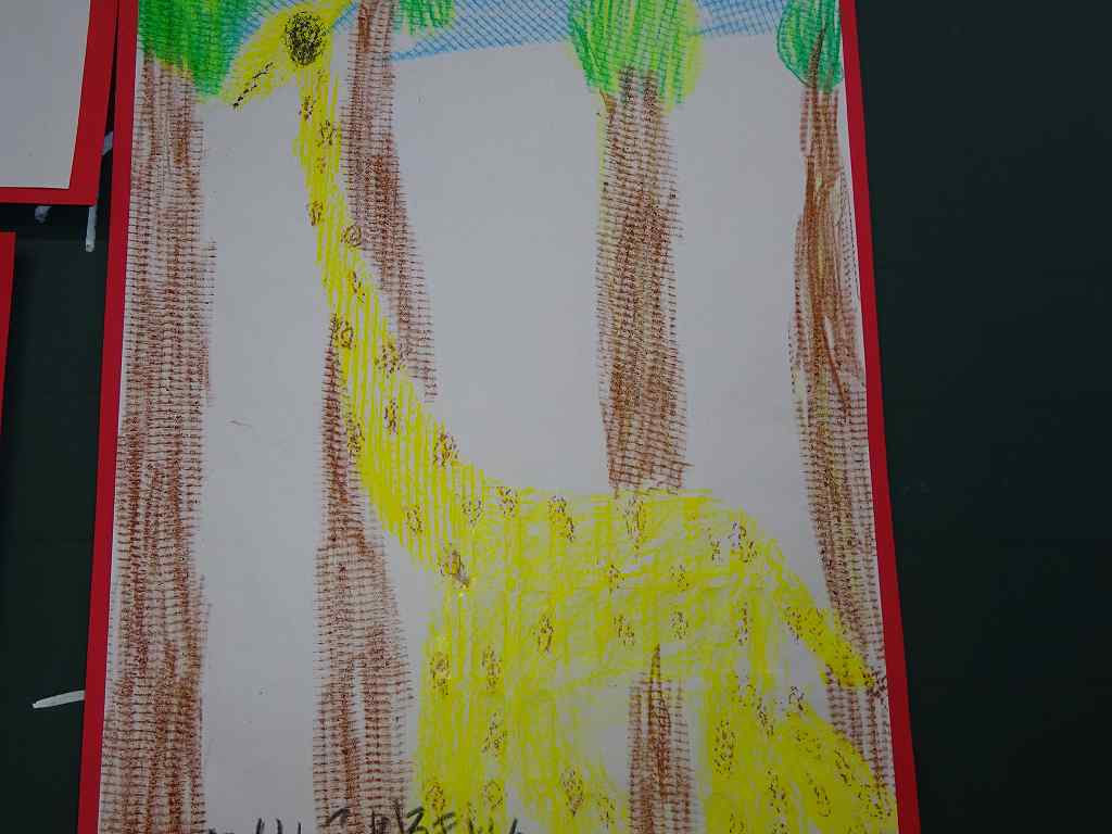 最後は、こすりだした模様から作品を作りました。「かめができたよ。」「森の中のきりんだよ。」「きょうりゅうがかけた!」とお互いの作品を鑑賞して楽しみました。