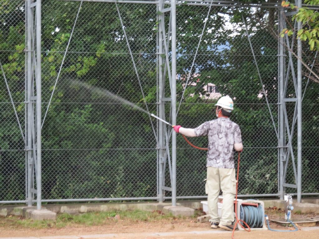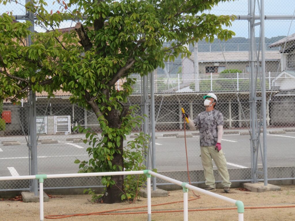 本日、早朝5時40分から、校門周り、桜の木、運動場南側フェンス外や側溝等について、消毒作業を業者の方にしていただきました。これは、運動会前に毎年実施しているものですが、今年は蜂や蚊などが、朝夕の涼しさとともに、急に多く見られるようになり、いろいろな害虫も含めて駆除するために行ってもらいました。特に、側溝の中は、家庭用スプレーでは効果があまりありません。また、フェンス外からの藪蚊も飛んでおり、運動会が少しでも快適に実施できることを願って、早めに消毒しました。