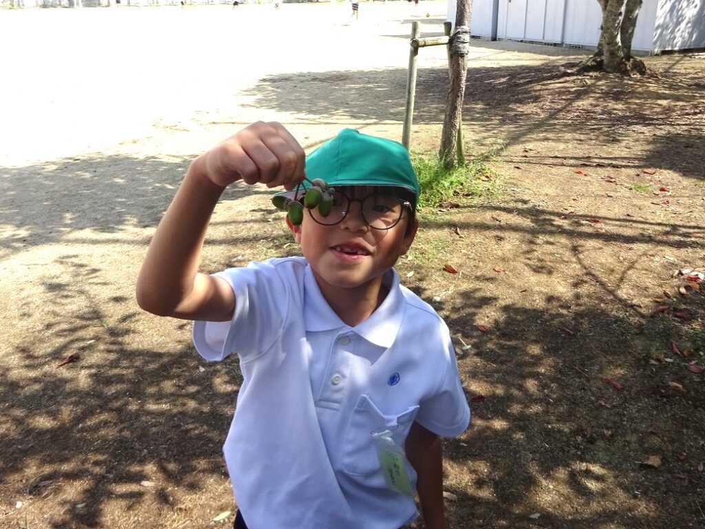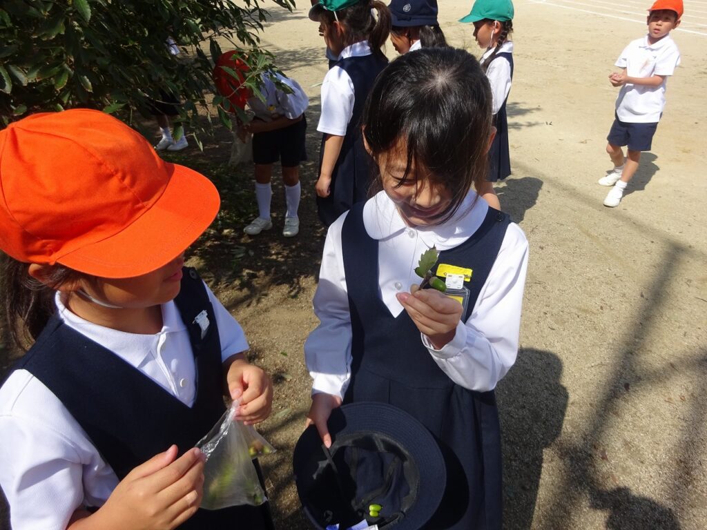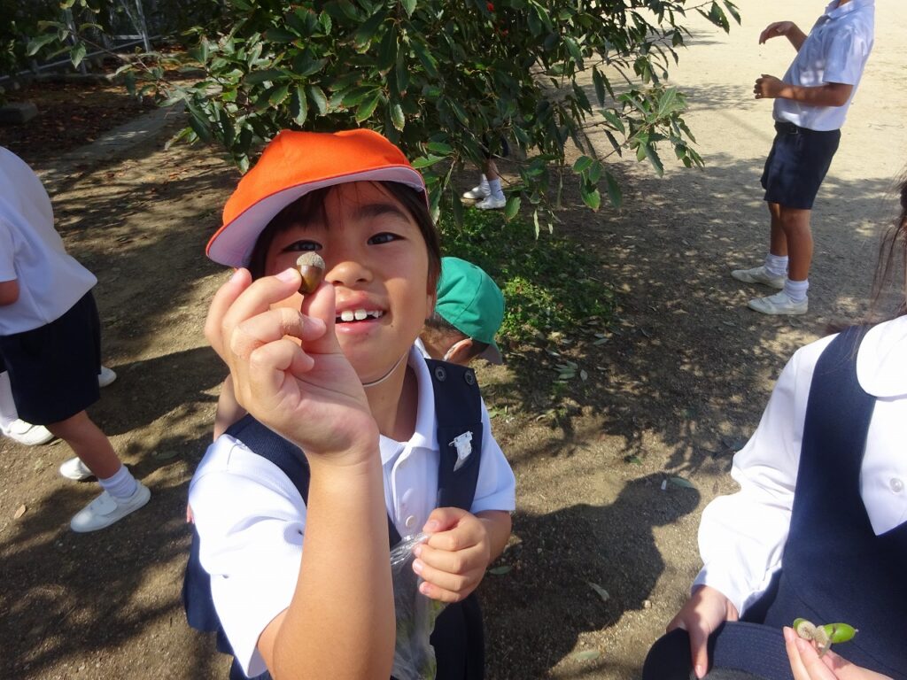 1・2年生の中にはどんぐりを集めることに熱中している子もいて、今日も木の周りに集まってどんぐりを集めていました。「ふたごのどんぐりをみつけたよ!」「あたまだけのどんぐりもあったよ。」など、楽しそうな声がたくさん聞こえてきました。
