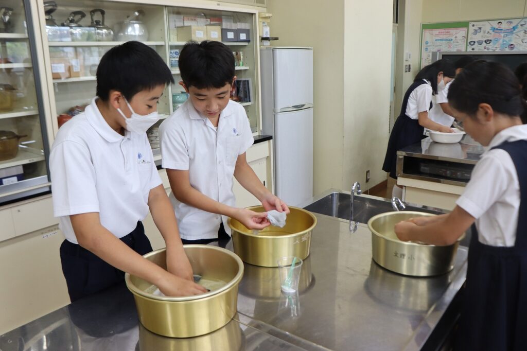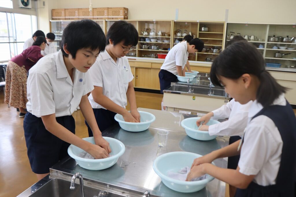本日、6年生は家庭科で、自分のくつ下を手洗いで洗たくしました。最初は2組の子どもたちが挑戦しました。