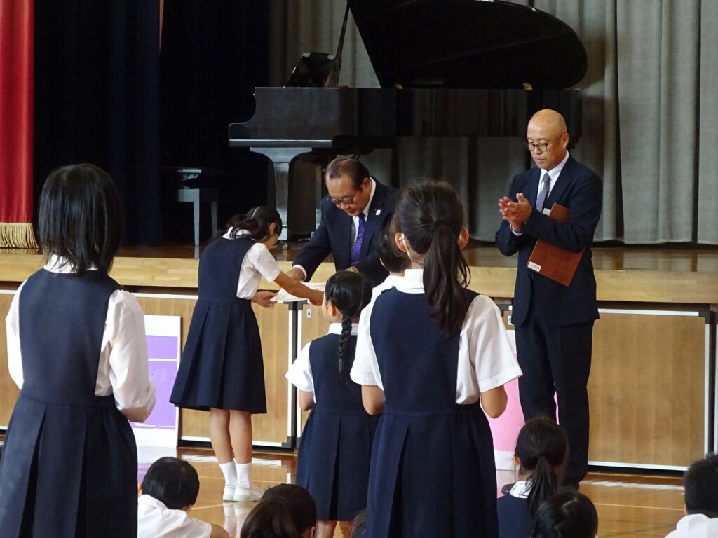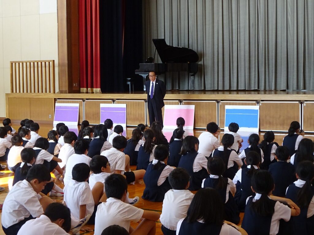 本日、児童朝会がありました。本日は、表彰と校長先生のお話、4年1組の朗読がありました。