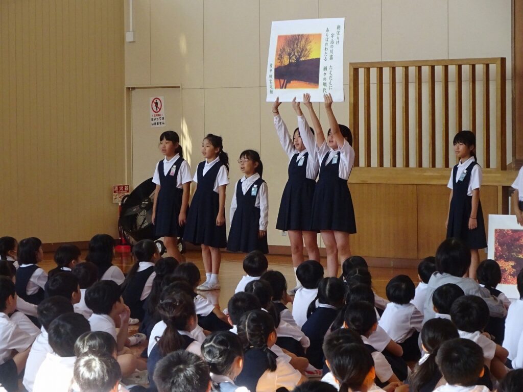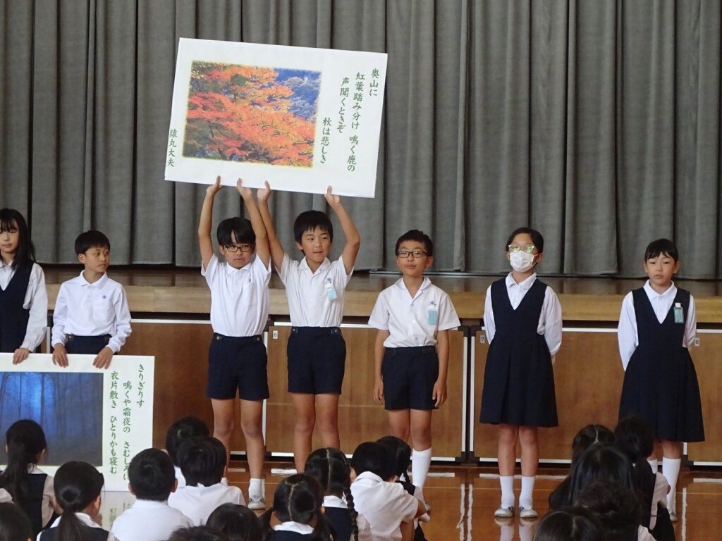 トピックス 4年1組 朝の朗読 HOME > トピックス > 4年1組 朝の朗読 4年1組 朝の朗読 2025年10月6日 本日、児童朝会で4年1組の朗読がありました。4年1組は「百人一首」の自分が好きな詩の朗読をしました。はきはきと発表することができました。