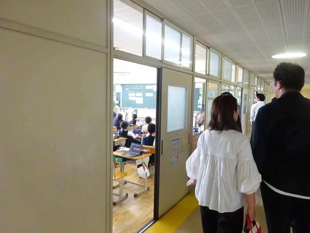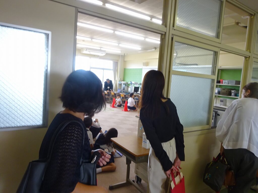 体験授業の後は、自由に校舎内見学を行いました。1階では1年生の教室、2階では、2・3年生の授業や体育館での授業、低学年用図書室を見学しました。3階では、4年生の授業、英語や音楽の授業、中学年用図書室を見学し、4階では5・6年生の授業、コンピュータ室での授業、高学年用図書室を見ていただきました。