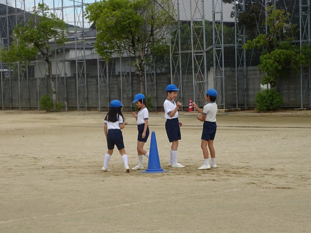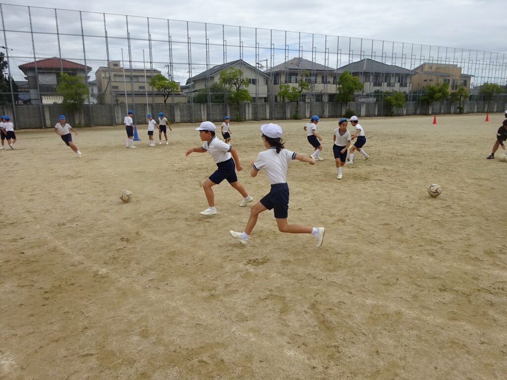始めはじゃんけんをして勝ったら次の場所に進む「すごろくゲーム」を行いました。次に、二人組になって、1人は歩いてもう1人はドリブルで追いかけていきました。始めは、なかなか思うようにボールを動かすことが難しそうでした。何回か繰り返していくことで少しずつ友達をドリブルで追いかけていくことができるようになっていきました。最後に、「ドリブルゲーム」を行いました。シュートをするのではなく、ドリブルやパスで相手を抜き、ゴールゾーンより後ろでボールを止めると1点というゲームでした。練習の成果を発揮してゲームを行うことができました。終始笑顔で取り組むことができました。