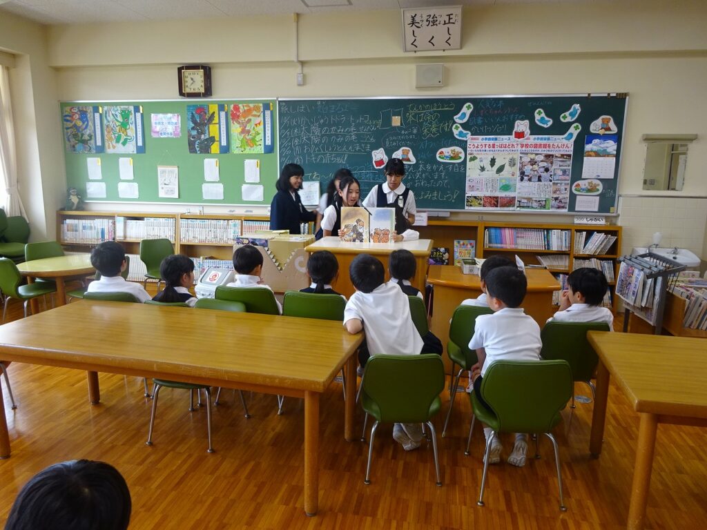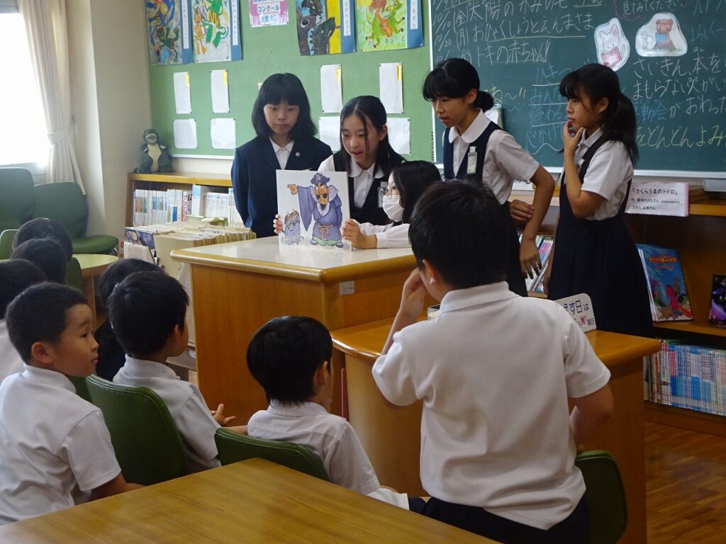 低学年の図書室では、月に何度か、図書委員会が業間休みに紙しばいの読み聞かせを行っています。