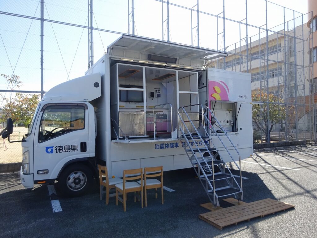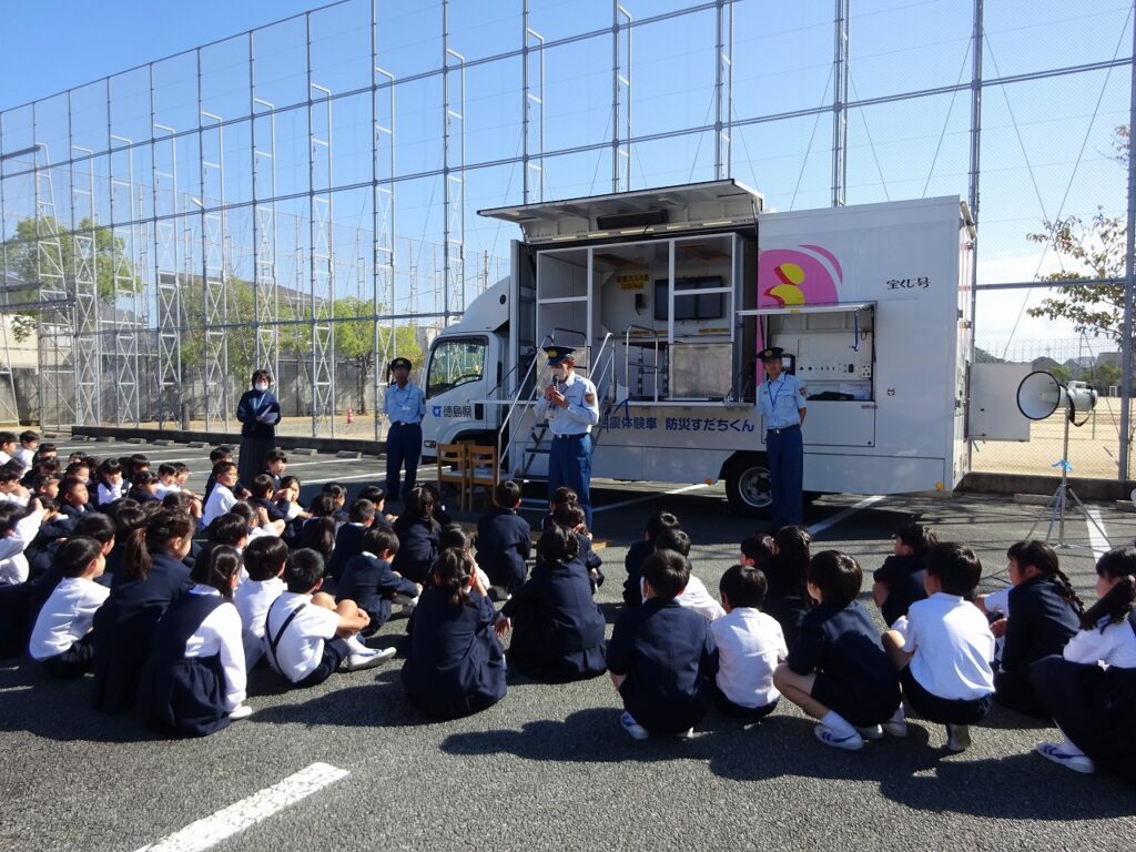 さらに今日は、訓練につづき3校時目に、徳島東消防署から県下で1台しかない起震車(実際に地震の揺れを体験する機材を装備した車)で、南海トラフ地震で想定されている揺れを子どもたちに体験してもらいました。実際の地震の揺れを体験して、地震が私たちにとって、命をも奪ってしまう大きな災害であるということを感じて、考える時間にしました。