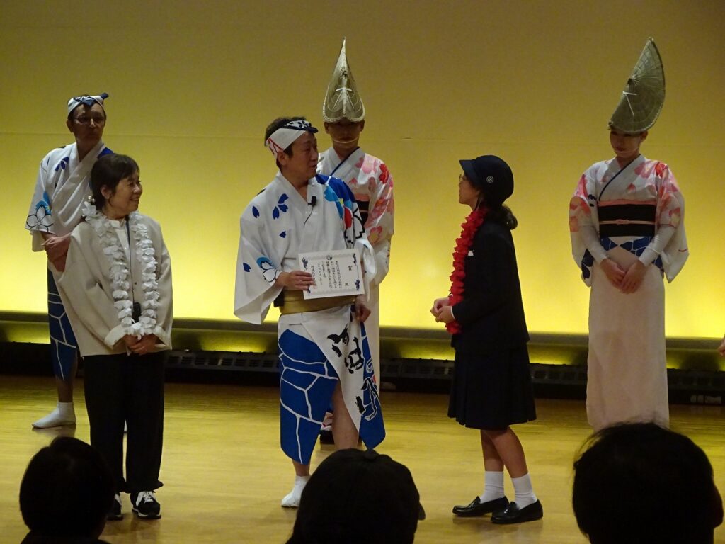 阿波おどり公演では、「阿波の風」の連員さんの阿波踊りを見せていただきました。また、阿波踊りの踊りが昔からどのように変わってきたのかを、実際に躍りで見せていただきました。途中で、阿波おどりのおどり方を教えていただき、最後にはみんなで阿波おどりを楽しみました。踊りでは、東條先生が優秀賞をいただき、篠賀さんが最優秀賞をいただきました。