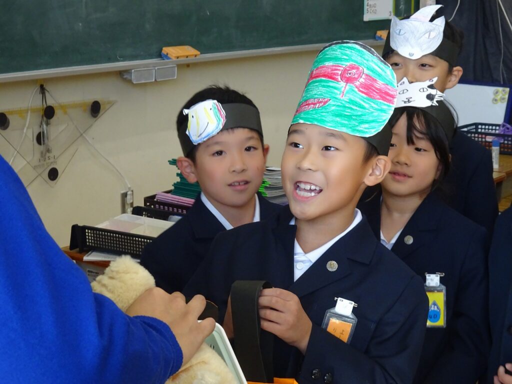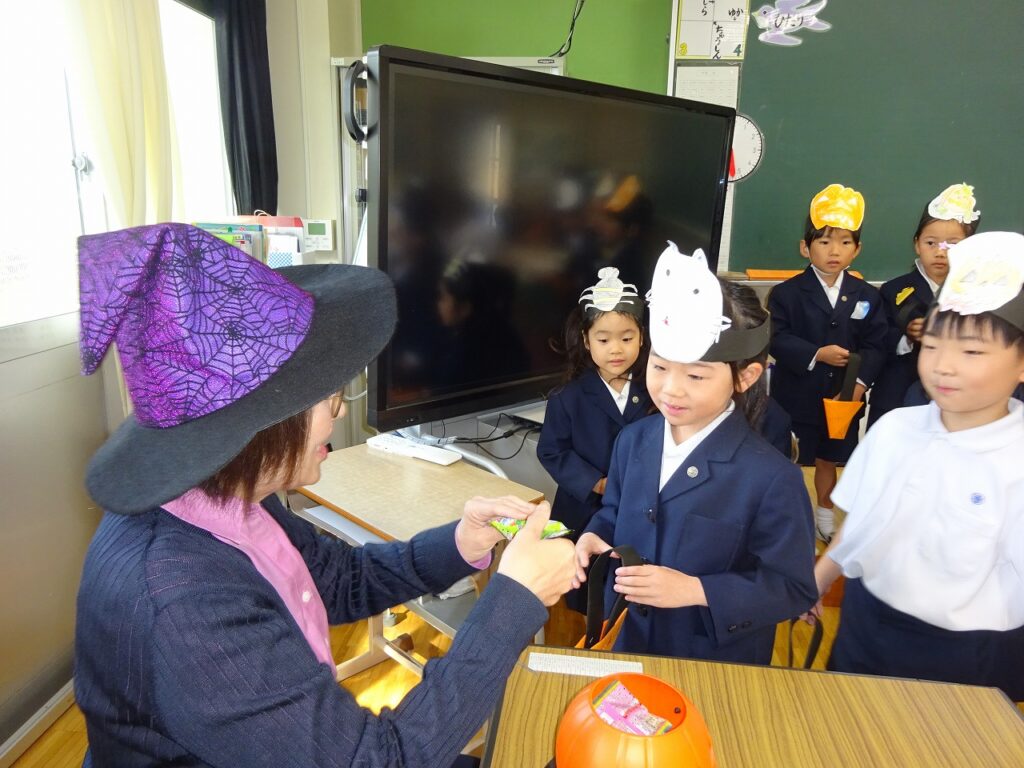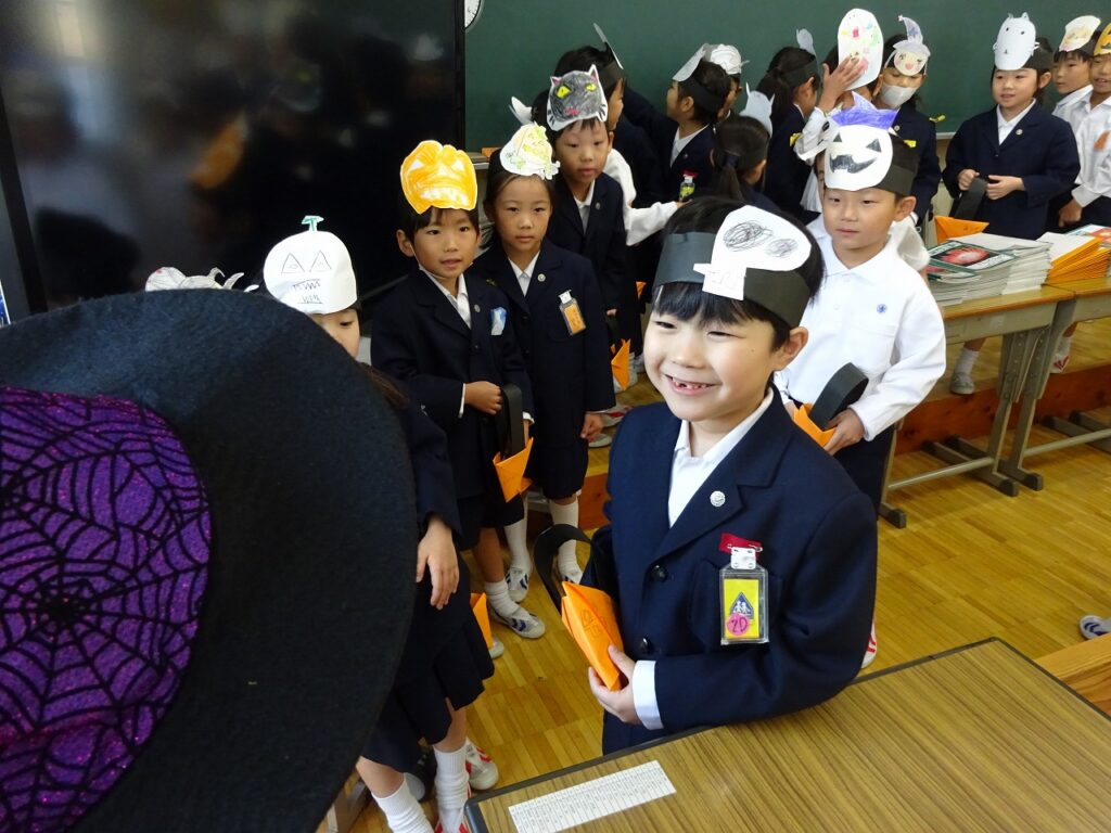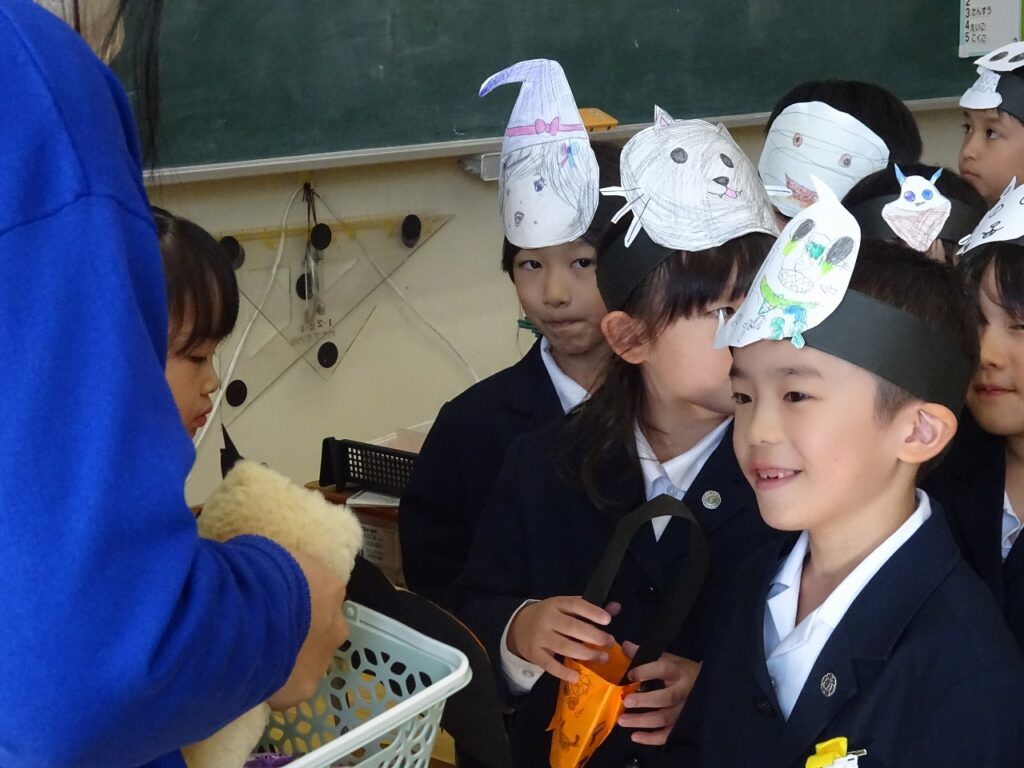 本日の英語の授業で、ハロウィンパーティーを行いました。自作のマスクとキャンディーポケットを持って「ハッピーハロウィン!」「トリックオアトリート!」担任の先生からお菓子をもらいました。その後は、英語室でハロウィンの絵本を読んでもらい楽しい時間を過ごしました。
