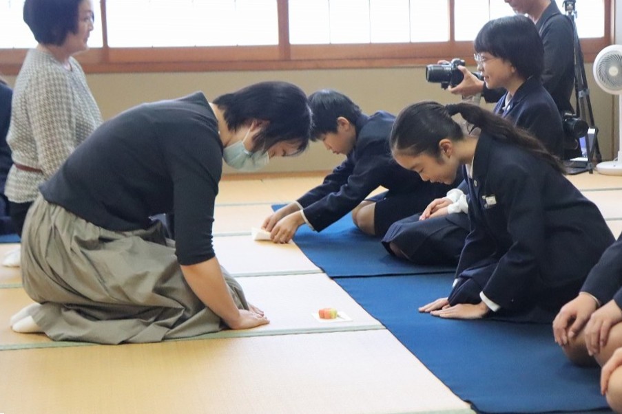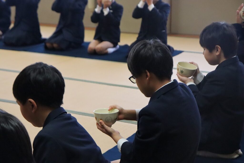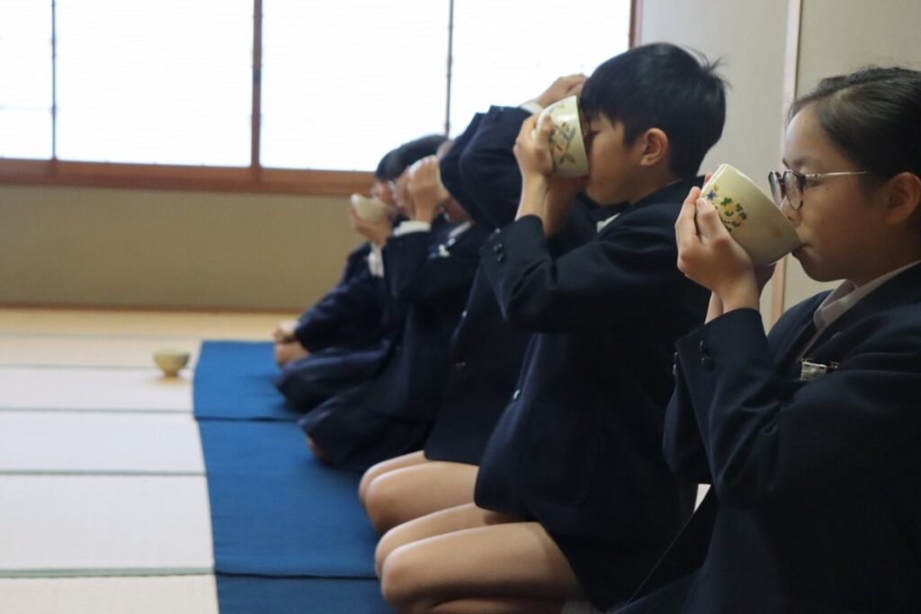 また、5年生からは主菓子をいただきます。懐紙の上で切り、一口ずついただきます。少し難しいようでしたが、これも上手に行うことができていました。