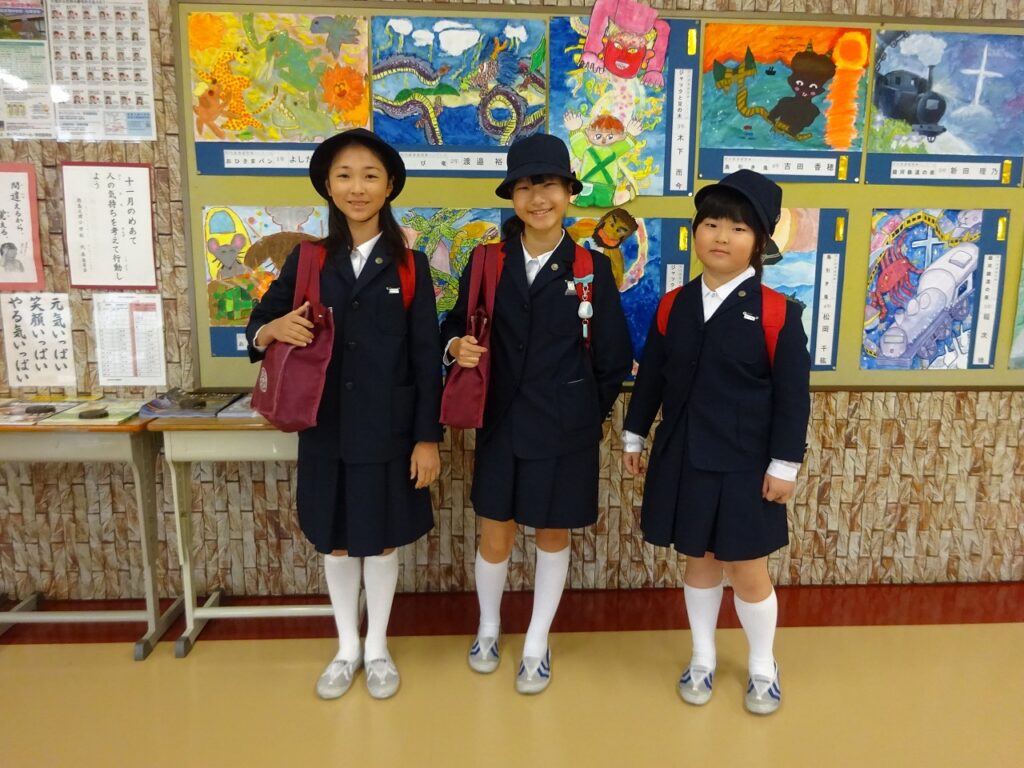 本校では、本日より冬服へ完全移行となりました。夏服は白色の制帽でしたが、紺色の制帽に変わります。また、女子児童のスカートは水色から紺色に変わります。