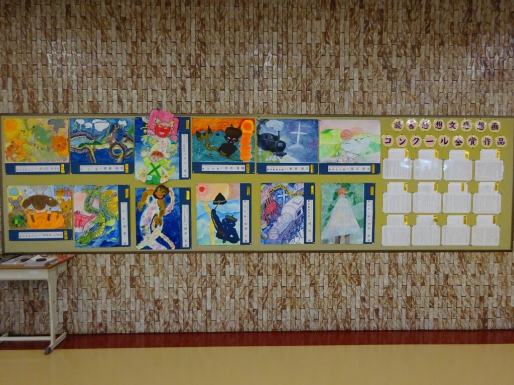 今年も校内読書感想文・感想画コンクールとしてクラスごとに作品を制作しました。このコンクールでは、各学年の発達段階に応じた図書を題材として、その感想文と印象に残った場面を描いた感想画を制作しています。制作された作品のなかから、各クラスで金賞・銀賞・銅賞の作品が選ばれます。選ばれた金賞作品を、11月の玄関掲示として張り出しました。