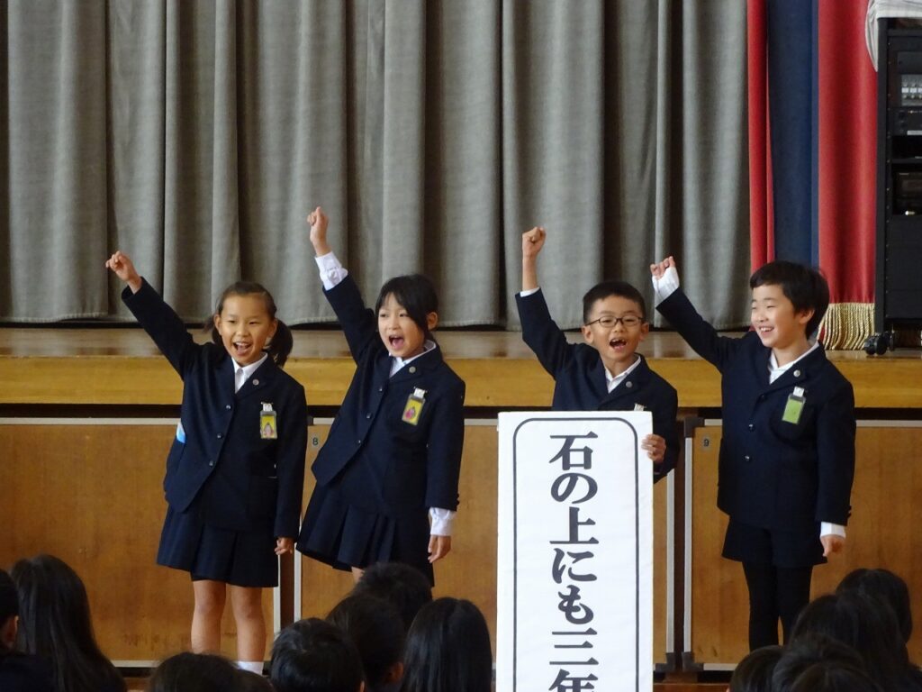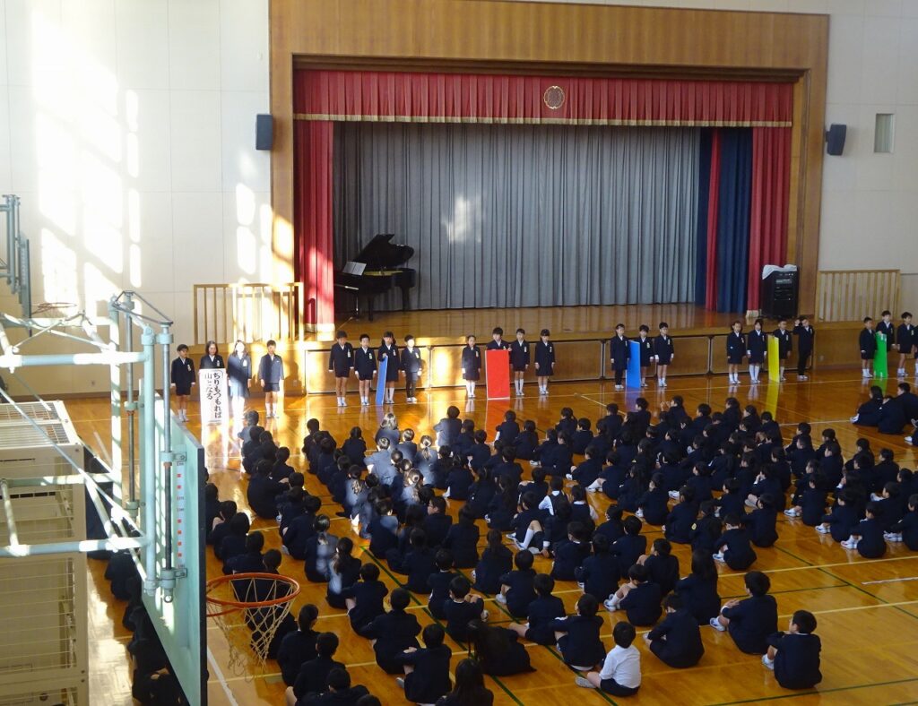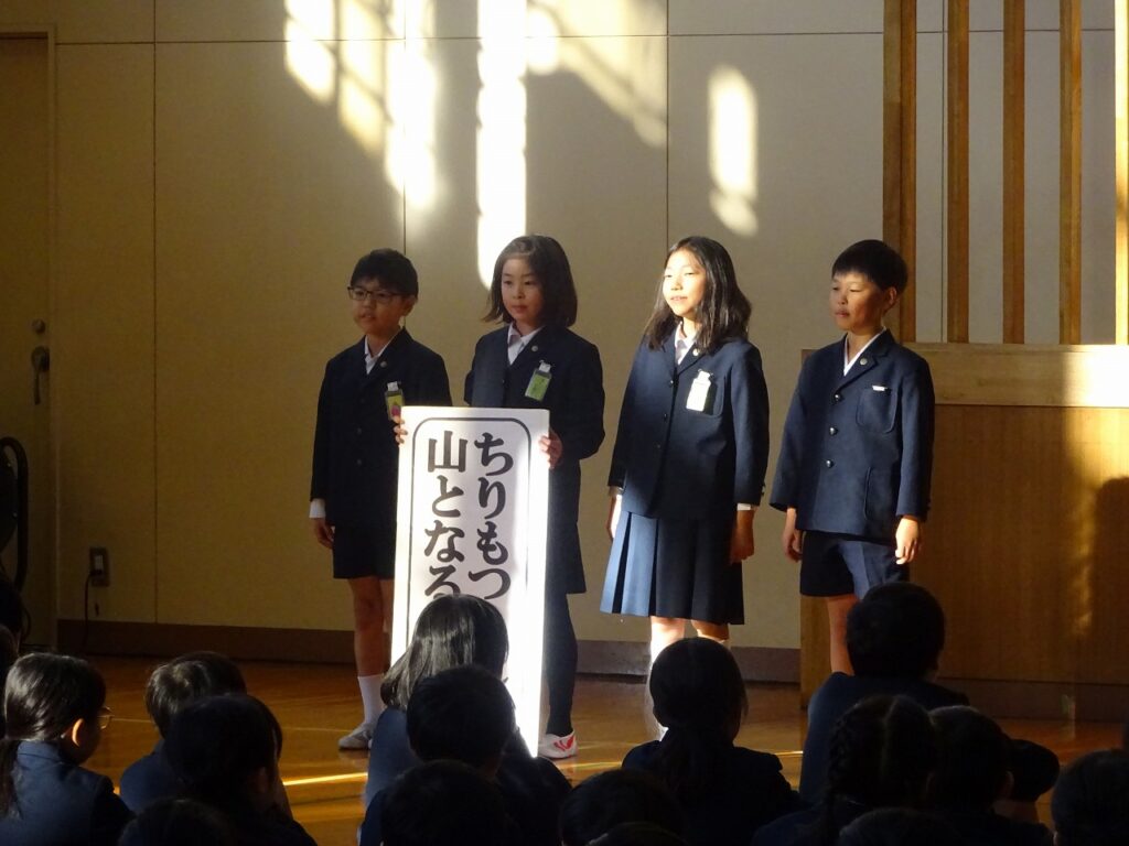 本日の児童朝会では、2年1組の子どもたちが「ことわざ」の発表をしました。今まで学習してきた中から、今の生活で大切にしたい格言を6つ選んで、グループに分かれて発表をしました。「ことわざ」の意味を、自分たちの実生活を踏まえながら説明していました。