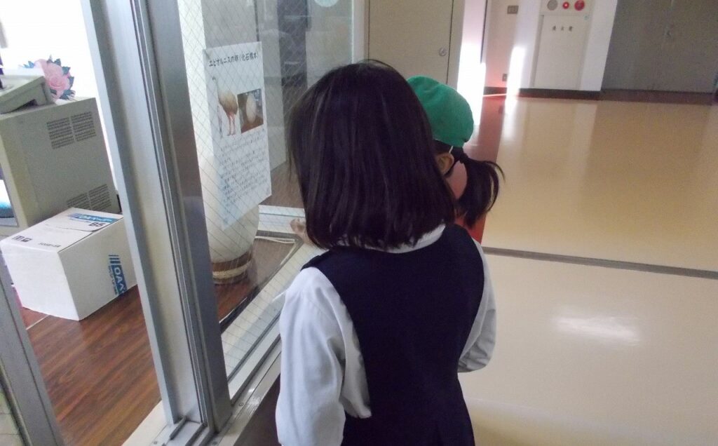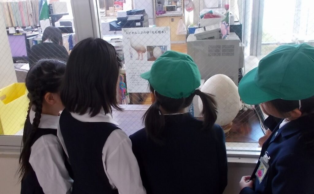 休み時間になると、子どもたちは職員室に飾っている卵を見に来ています。「エピオルニス?聞いたことないな」「すごい大きい!」など、子どもたちはエピオルニスの卵に興味津々な様子です。