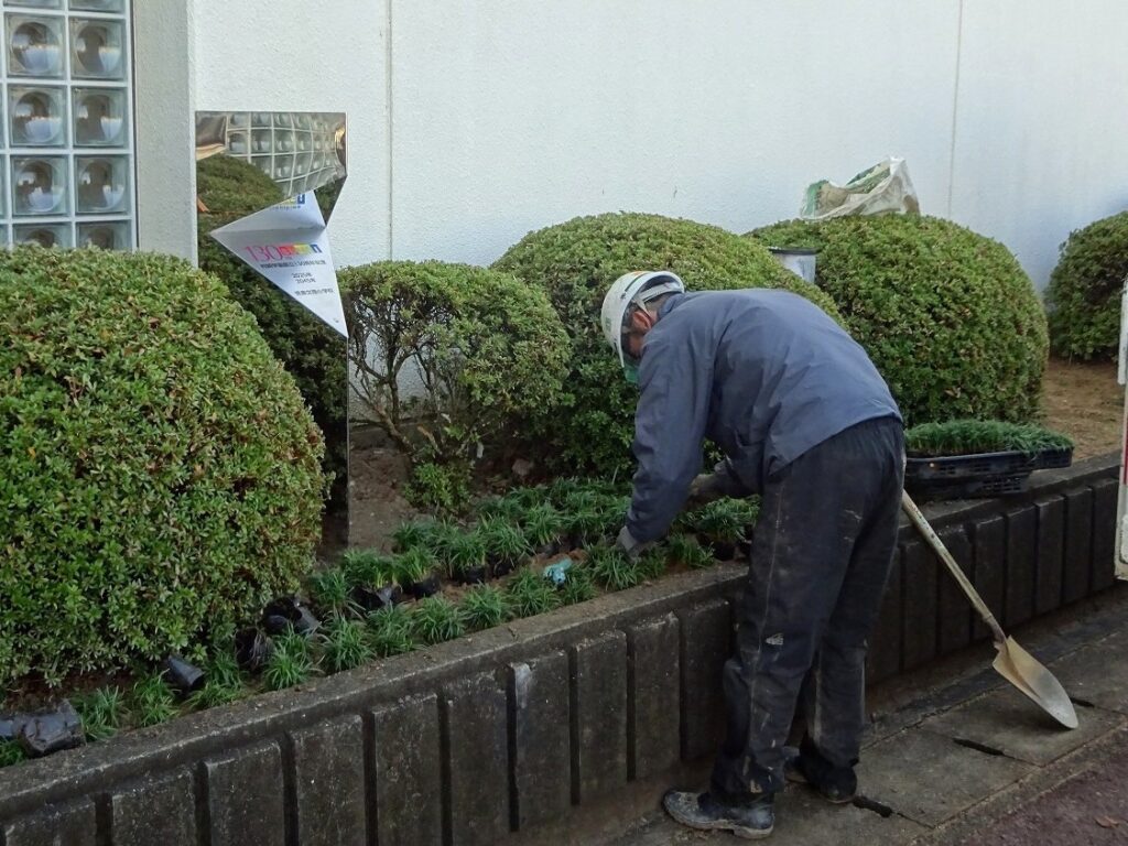 タイムカプセルの土台の周りに土を入れていただきました。さらに、標柱の周りには「竜の髭」の苗を植えてくださり、すべての工事が完了しました。