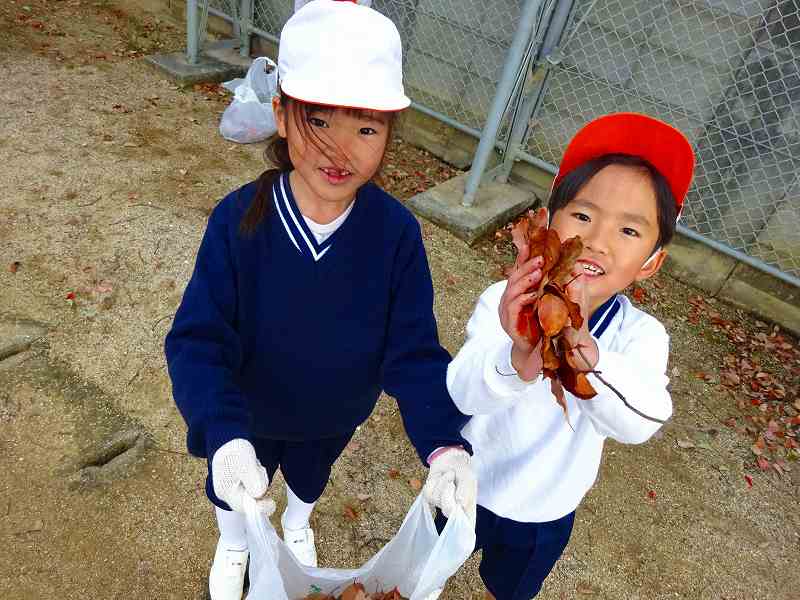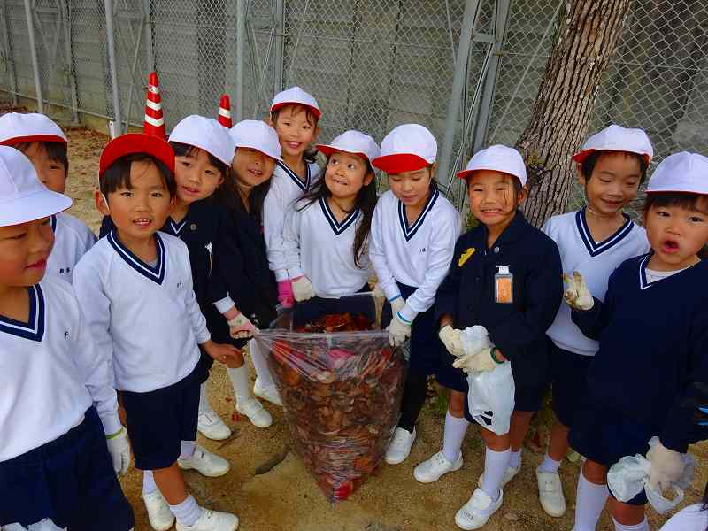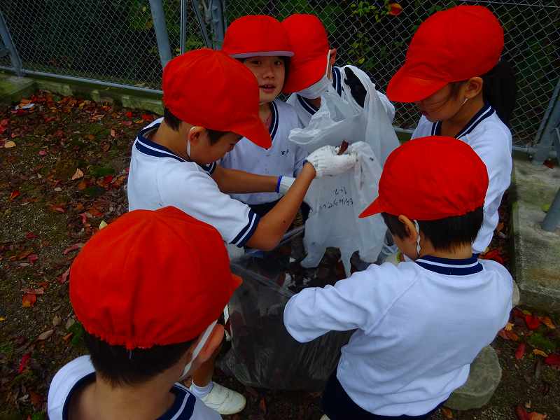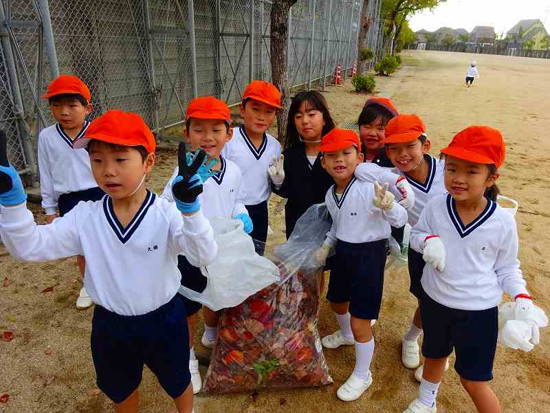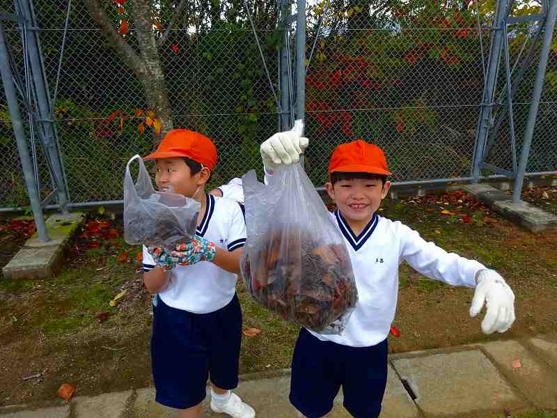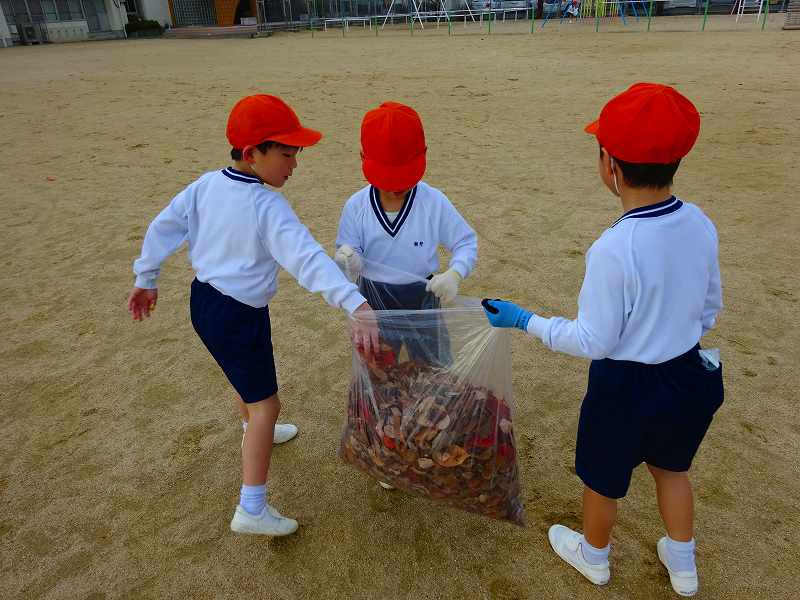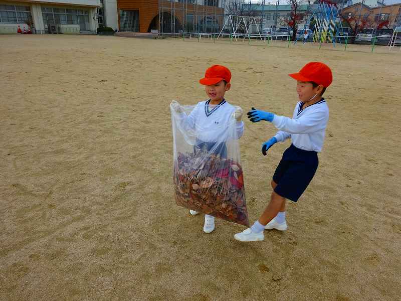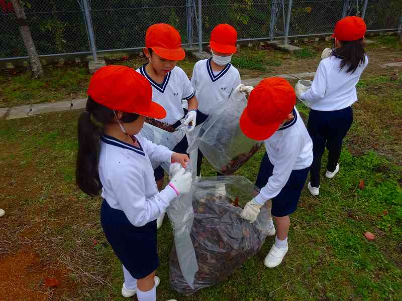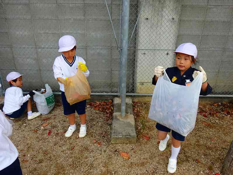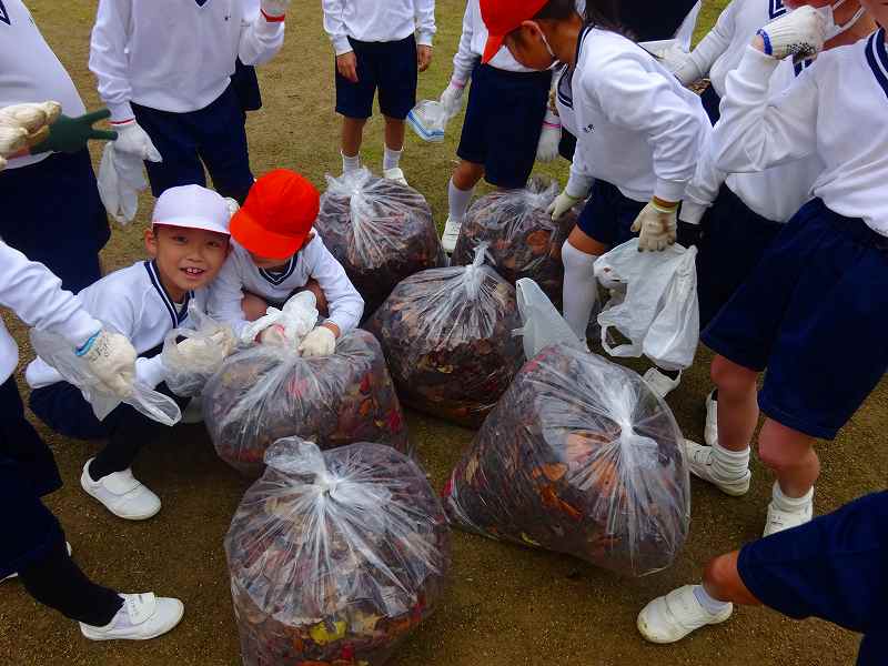 ボランティア終了後の子どもたちの袋には、たくさんの落ち葉が入っていました。「こんなにいっぱい拾ったよ。」と見せ合っていました。みんなが集めたのを大きな袋にまとめて入れたのを見て、「やっぱり、たのしかったよ。」「ふくろが、いっぱいになった!」「学校がきれいになったね。」と、自分たちが学校のために何かできたという気持ちで、どの子も満足そうな表情でした。
