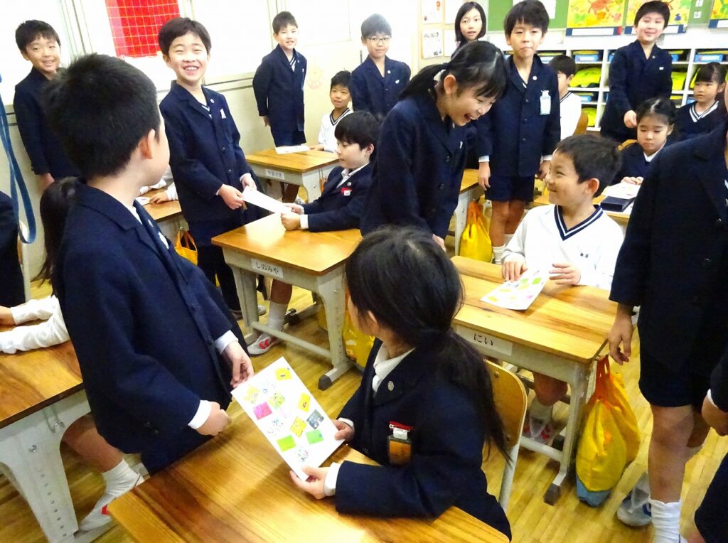 1年生を招待するため、招待状を一人ひとり手に持って、1年生の教室へ行きました。「14種類のおもちゃのお店を出すので、楽しんでください。」と話をし、「楽しみにしていてね」「来てね」と笑顔で声をかけながら、招待状を渡しました。